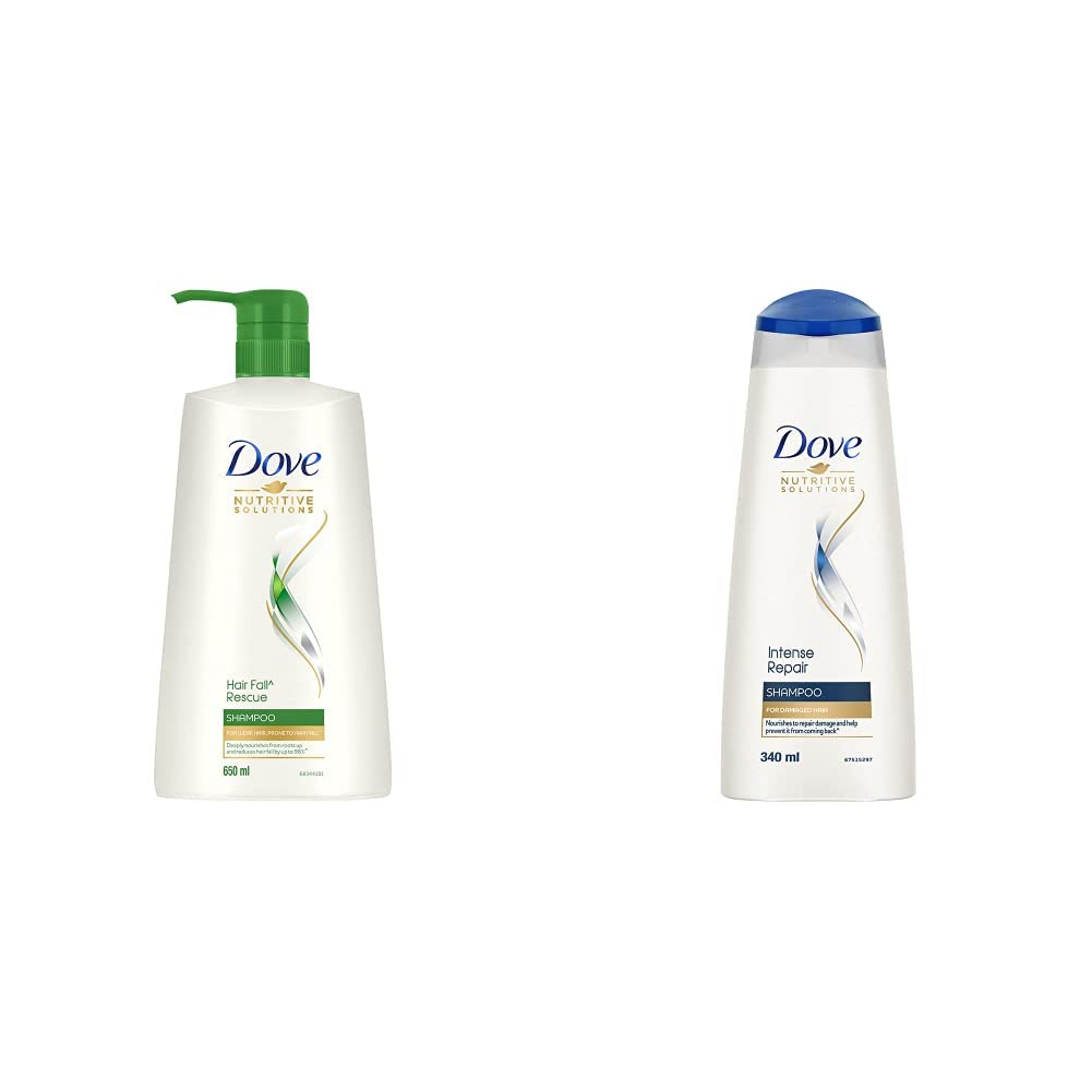 Dove Hair Fall Rescue Shampoo 650mlWe love the feeling of beautiful hair â but daily damage can leave your hair prone to breakage. Let hair fall be an issue of the past. Use the hair fall rescue shampoo from Dove regularly to get thick and luscious hair as the shampoo works to reduce hair fall by up to 98 percent . Specially formulated for better hair fall control Dove nutritive solutions hair fall rescue shampoo strengthens and nourishes fragile hair from roots up. Perfect as a daily hair fall treatment the gentle formula fortifies strands to reduce hair fall . Enriched with nutrilock actives our best shampoo for hair fall immediately seals cuticles and strengthens strands to help minimize hair fall due to breakages leaving them looking fuller. Healthier hair means lesser breakage and reduced hair fall . Buy Dove hair fall rescue shampoo and forget your hair fall troubles. Leaving your hair feeling strong and beautiful day after day. Say no to hair fall worries and do more in life. Dove hair fall rescue lets you be stronger bolder and closer every day. Hair fall refers to hair breakage based on a lab test with Dove hair fall rescue system vs non-conditioning shampoo.Dove Intense Repair Shampoo 340mlIs your hair showing signs of damage â split ends dryness roughness or hair fall. The secret of how to repair damaged hair. A strengthening shampoo that helps to treat the signs of damage with two-way care for both long and short-term results . Give your hair the essential care it deserves with Dove intense repair shampoo. The intense repair shampoo works to restore the health and shine of your hair. It contains fibre actives which penetrate your hair and rebuild damaged hair to renew the lost gloss and vigour and give life to your damaged hair. Gentle enough for daily use Dove intense repair shampoo helps to immediately repair strands while nourishing them from within for healthy looking hair thatâs stronger this shampoo for damaged hair repairs signs of damage for smooth and strong hair. Formulated with fibre actives this shampoo for damaged hair reinforces strands to prevent the signs of damage on hair. Nourishment for damaged hair to leave you with beautiful looking hair all day long. Based on lab test with Dove intense repair system vs non-conditioning shampoo strength against hair breakage based on lab test with Dove intense repair system vs. Non-conditioning shampoo. How to use :Completely soak your hair and massage your shampoo gently over your scalp. Rinse it out well. Usually rinse and repeat? For daily shampooing the rinse and repeat rule isn't actually necessary (unless you've been trigger-happy with the hairspray) so just once will do.