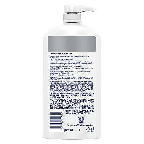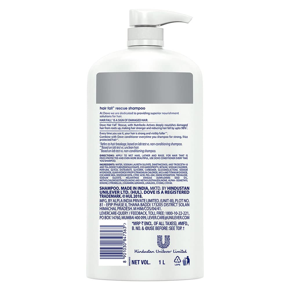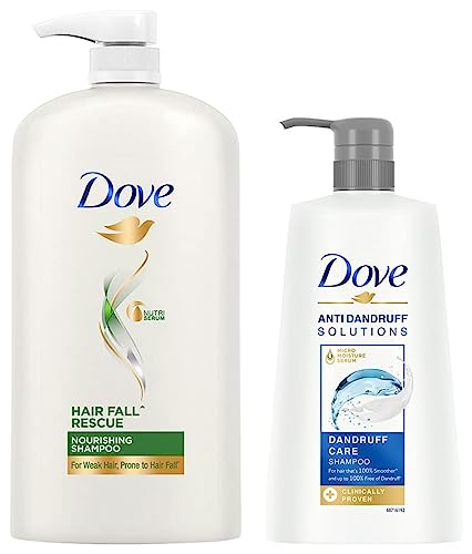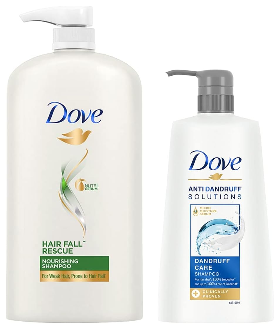 Dove Hair Fall Rescue Shampoo For Weak Hair 1 LtrWe love the feeling of beautiful hair â but daily hair damage can leave your hair prone to breakage. Let hair fall* be an issue of the past! Use the Hair Fall* Rescue Shampoo from Dove regularly to get thick and luscious looking hair as the Dove shampoo works to reduce hair fall by up to 98%*. Specially formulated for better hair fall* control Dove Nutritive Solutions Hair Fall* Rescue Shampoo strengthens and nourishes fragile hair from roots up. Perfect as a daily hair fall* solution this unique formula fortifies strands to reduce hair fall*. Enriched with Nutrilock Actives our best shampoo for hair fall* immediately helps seal cuticles and strengthens strands to help minimize hair fall due to breakages leaving them looking fuller**. Healthier looking hair means lesser breakage and reduced hair fall*! Buy Dove Hair Fall Rescue Shampoo and forget your hair fall* troubles. Leaves your hair feeling strong and beautiful day after day. Say no to hair fall* worries and do more in life. Dove Hair Fall* Rescue lets you be stronger bolder and closer every day.*Hair fall refers to hair breakage**Hairfall due to breakage Based on a lab test with Dove Hair Fall Rescue System vs non-conditioning shampoo Dove Anti Dandruff Solutions Shampoo 650 ml Prevents Dandruff & Dry Scalp Mild Daily Shampoo for Smooth & Frizz Free Hair - For Men & WomenScared of going out with white scalp flakes over your shoulder? When white flakes appear all we want to know is how to prevent dandruff â and quickly. Say 'bye' to dandruff and dryness with the Dove Dandruff Care Shampoo. The ZPTO formula is clinically proven to target dandruff at its source. This shampoo removes dandruff* from your scalp without causing harm to your hair. Clinically tested the formula enriched with ZPTO is proven to be successful at removing dandruff without leaving your hair dry & rough. ZPTO formula starts to clear visible flakes from the first wash. This gentle shampoo effectively relieves dandruff associated itches and clears up white flakes with regular use. The unique formula nourishes from roots up combining beautiful hair results with effective dandruff relief* for hair you can be proud of in no time. This anti-dandruff shampoo nourishes your hair from root up combining beautiful hair results with effective dandruff relief*. Step out of the shower to soft smooth and visibly flake- free strands*: quick results with nourishing care too. For best results use Dove Dandruff Care shampoo along with Dove Dandruff Care conditioner together. *No visible flakes with regular product use effect may vary with person.