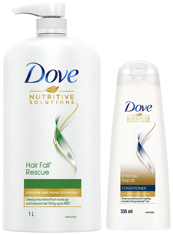 Dove Hair Fall Rescue Shampoo For Weak Hair 1 LtrWe love the feeling of beautiful hair â but daily hair damage can leave your hair prone to breakage. Let hair fall* be an issue of the past! Use the Hair Fall* Rescue Shampoo from Dove regularly to get thick and luscious looking hair as the Dove shampoo works to reduce hair fall by up to 98%*. Specially formulated for better hair fall* control Dove Nutritive Solutions Hair Fall* Rescue Shampoo strengthens and nourishes fragile hair from roots up. Perfect as a daily hair fall* solution this unique formula fortifies strands to reduce hair fall*. Enriched with Nutrilock Actives our best shampoo for hair fall* immediately helps seal cuticles and strengthens strands to help minimize hair fall due to breakages leaving them looking fuller**. Healthier looking hair means lesser breakage and reduced hair fall*! Buy Dove Hair Fall Rescue Shampoo and forget your hair fall* troubles. Leaves your hair feeling strong and beautiful day after day. Say no to hair fall* worries and do more in life. Dove Hair Fall* Rescue lets you be stronger bolder and closer every day.*Hair fall refers to hair breakage**Hairfall due to breakage Based on a lab test with Dove Hair Fall Rescue System vs non-conditioning shampoo Dove Intense Repair Hair Conditioner 340 ml With Keratin Actives to Smoothen Dry and Frizzy Hair - Deep Conditioner for Damaged Hair for Men & WomenDoes your hair get frizzy and unmanageable? Are you left wishing for a remedy to fix your frizzy tassels? Do you want to know the secret to fixing frizzy hair? Try New Dove Intense Repair Conditioner. Control frizz with a nourishing conditioner thatâs formulated to nourish and help with frizz prevention. Formulated with Keratin Actives Dove Intense Repair Conditioner helps to nourish dry and frizzy hair with two-way care. It controls external signs of dryness in the form of frizz while nourishing strands to help them look their best. This conditioner for frizzy damaged hair leaves hair visibly smooth and more manageable â giving you smoother hair* that you will be proud of. Use it after your shampoo on damp hair for best results. This nourishing conditioner works immediately to smoothen the hair surface deeply nourishing to moisturize hair strands for healthier looking and smoother*hair use Dove repair conditioner. With every use youâll be left with shiny and beautiful hair. Buy New Dove Intense Repair conditioner and treat your hair to a look that will be the cause of envy among all your friends. Dove Conditioners for 100% care. *Based on lab test with Dove Intense Repair system vs non-conditioning shampoo