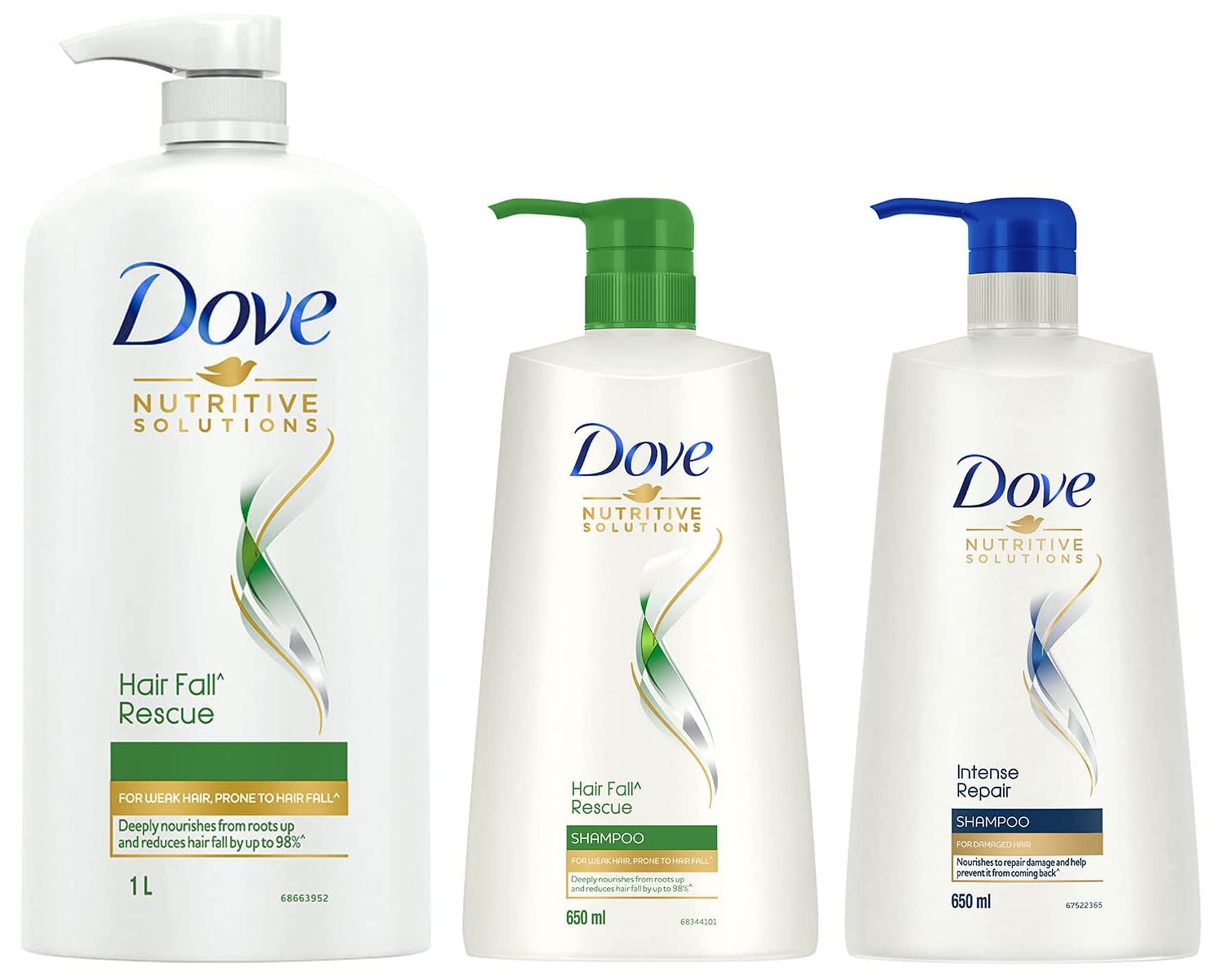 Dove Hair Fall Rescue Shampoo For Weak Hair 1 LtrWe love the feeling of beautiful hair â but daily hair damage can leave your hair prone to breakage. Let hair fall* be an issue of the past! Use the Hair Fall* Rescue Shampoo from Dove regularly to get thick and luscious looking hair as the Dove shampoo works to reduce hair fall by up to 98%*. Specially formulated for better hair fall* control Dove Nutritive Solutions Hair Fall* Rescue Shampoo strengthens and nourishes fragile hair from roots up. Perfect as a daily hair fall* solution this unique formula fortifies strands to reduce hair fall*. Enriched with Nutrilock Actives our best shampoo for hair fall* immediately helps seal cuticles and strengthens strands to help minimize hair fall due to breakages leaving them looking fuller**. Healthier looking hair means lesser breakage and reduced hair fall*! Buy Dove Hair Fall Rescue Shampoo and forget your hair fall* troubles. Leaves your hair feeling strong and beautiful day after day. Say no to hair fall* worries and do more in life. Dove Hair Fall* Rescue lets you be stronger bolder and closer every day.*Hair fall refers to hair breakage**Hairfall due to breakage Based on a lab test with Dove Hair Fall Rescue System vs non-conditioning shampoo Dove Intense Repair Hair Shampoo 650 ml Repairs Dry and Damaged Hair Moisturizing Shampoo for Smooth & Strong Hair - Mild Shampoo for Women & MenIs your hair showing signs of damage â split ends dryness roughness or hair fall? The secret of how to repair damaged hair? A strengthening shampoo that helps to treat the signs of damage with two-way care for both long and short-term results*. Give your hair the essential care it deserves with Dove Intense Repair Shampoo. The Intense Repair Shampoo works to restore the health and shine of your hair. It contains Fibre Actives which penetrate your hair and rebuild damaged hair to renew the lost gloss and vigour and give life to your damaged hair. Gentle enough for daily use Dove Intense Repair Shampoo helps to immediately repair strands while nourishing them from within for healthy looking hair thatâs stronger** Dove Intense Repair Shampoo for damaged hair repairs signs of damage for smooth and strong hair. Dove Intense Repair Shampoo formulated with Fibre Actives this shampoo for damaged hair reinforces strands to prevent the signs of damage on hair. Nourishment for damaged hair to leave you with beautiful looking hair all day long. *Based on lab test with Dove Intense Repair system vs non-conditioning shampoo **Strength against hair breakage based on lab test with Dove Intense Repair system vs. non-conditioning shampoo. Ingredients Water Sodium Laureth Sulfate Dimethiconol and Trideceth-10 and TEA-Dodecylbenzenesulfonate Glycol Distearate Cocamidopropyl Betaine Sodium Chloride Perfume Glycerin Cocamide MEA Amodimethicone and Cetrimonium Chloride and Trideceth-12 Guar Hydroxypropyltrimonium Chloride Acrylates/Beheneth-25 Methacrylate Copolymer Styrene/Acrylates Copolymer Mica and Titanium Dioxide Sodium Hydroxide Disodium EDTA Gluconolactone Trehalose Adipic Acid Sodium Sulfate PEG-45M DMDM Hydantoin Helianthus Annuus (Sunflower) Seed Oil Methylchloroisothiazolinone and Methylisothiazolinone Alpha-Isomethyl Ionone Citronellol Geraniol Linalool.Dove Hair Fall Rescue Shampoo 650 ml For Damaged Hair Hair Fall Control for Thicker Hair - Mild Daily Anti Hair Fall Shampoo for Men & WomenWe love the feeling of beautiful hair â but daily hair damage can leave your hair prone to breakage. Let hair fall* be an issue of the past! Use the Hair Fall* Rescue Shampoo from Dove regularly to get thick and luscious looking hair as the Dove shampoo works to reduce hair fall by up to 98%*. Specially formulated for better hair fall* control Dove Nutritive Solutions Hair Fall* Rescue Shampoo strengthens and nourishes fragile hair from roots up. Perfect as a daily hair fall* solution this unique formula fortifies strands to reduce hair fall*. Enriched with Nutrilock Actives our best shampoo for hair fall* immediately helps seal cuticles and strengthens strands to help minimize hair fall due to breakages leaving them looking fuller**. Healthier looking hair means lesser breakage and reduced hair fall*! Buy Dove Hair Fall Rescue Shampoo and forget your hair fall* troubles. Leaves your hair feeling strong and beautiful day after day. Say no to hair fall* worries and do more in life. Dove Hair Fall* Rescue lets you be stronger bolder and closer every day.*Hair fall refers to hair breakage**Hairfall due to breakage Based on a lab test with Dove Hair Fall Rescue System vs non-conditioning shampoo