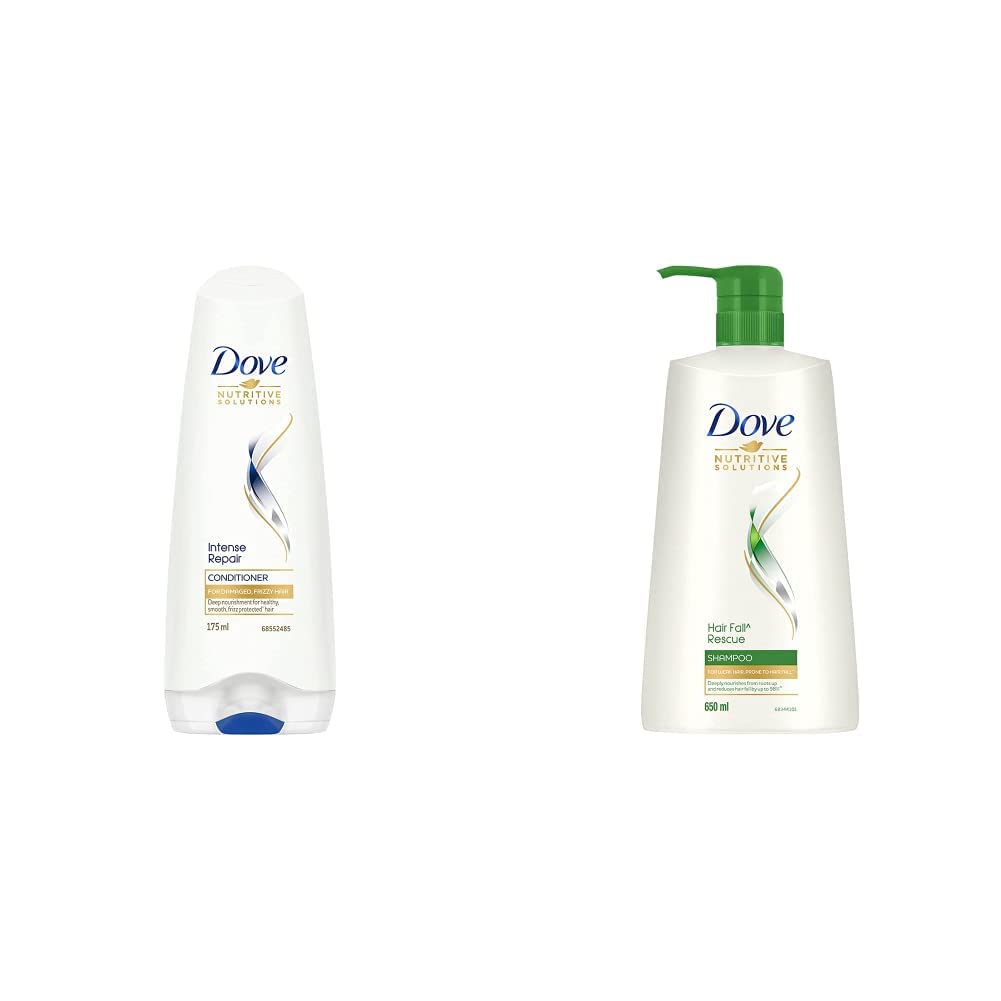 Dove Hair Therapy Intense Repair Conditioner 175mlDoes your hair get frizzy and unmanageable. Are you left wishing for a remedy to fix your frizzy tassels. Do you want to know the secret to fixing frizzy hair. Try new Dove intense repair conditioner. Control frizz with a nourishing conditioner thatâs formulated to nourish and help with frizz prevention. Formulated with keratin actives Dove intense repair conditioner helps to nourish dry and frizzy hair with two-way care. It controls external signs of dryness in the form of frizz while nourishing strands to help them look their best. This conditioner for frizzy damaged hair leaves hair visibly smooth and more manageable â giving you smoother hair that you will be proud of. Use it after your shampoo on damp hair for best results. This nourishing conditioner works immediately to smoothen the hair surface deeply nourishing to moisturize hair strands for healthier looking and smoother hair. With every use youâll be left with smooth shiny and beautiful hair. Buy new Dove intense repair conditioner and treat your hair to a look that will be the cause of envy among all your friends. Dove conditioners for 100 percent care. Based on lab test with Dove intense repair system vs non-conditioning shampoo.Dove Hair Fall Rescue Shampoo 650mlWe love the feeling of beautiful hair â but daily damage can leave your hair prone to breakage. Let hair fall be an issue of the past. Use the hair fall rescue shampoo from Dove regularly to get thick and luscious hair as the shampoo works to reduce hair fall by up to 98 percent . Specially formulated for better hair fall control Dove nutritive solutions hair fall rescue shampoo strengthens and nourishes fragile hair from roots up. Perfect as a daily hair fall treatment the gentle formula fortifies strands to reduce hair fall . Enriched with nutrilock actives our best shampoo for hair fall immediately seals cuticles and strengthens strands to help minimize hair fall due to breakages leaving them looking fuller. Healthier hair means lesser breakage and reduced hair fall . Buy Dove hair fall rescue shampoo and forget your hair fall troubles. Leaving your hair feeling strong and beautiful day after day. Say no to hair fall worries and do more in life. Dove hair fall rescue lets you be stronger bolder and closer every day. Hair fall refers to hair breakage based on a lab test with Dove hair fall rescue system vs non-conditioning shampoo.