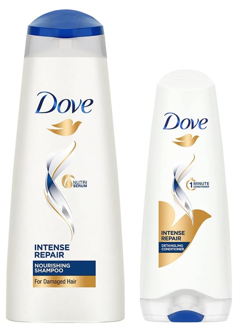 Dove Hair Therapy Intense Repair Conditioner 175mlDoes your hair get frizzy and unmanageable. Are you left wishing for a remedy to fix your frizzy tassels. Do you want to know the secret to fixing frizzy hair. Try new Dove intense repair conditioner. Control frizz with a nourishing conditioner thatâs formulated to nourish and help with frizz prevention. Formulated with keratin actives Dove intense repair conditioner helps to nourish dry and frizzy hair with two-way care. It controls external signs of dryness in the form of frizz while nourishing strands to help them look their best. This conditioner for frizzy damaged hair leaves hair visibly smooth and more manageable â giving you smoother hair that you will be proud of. Use it after your shampoo on damp hair for best results. This nourishing conditioner works immediately to smoothen the hair surface deeply nourishing to moisturize hair strands for healthier looking and smoother hair. With every use youâll be left with smooth shiny and beautiful hair. Buy new Dove intense repair conditioner and treat your hair to a look that will be the cause of envy among all your friends. Dove conditioners for 100 percent care. Based on lab test with Dove intense repair system vs non-conditioning shampoo.Dove Intense Repair Shampoo 340mlIs your hair showing signs of damage â split ends dryness roughness or hair fall. The secret of how to repair damaged hair. A strengthening shampoo that helps to treat the signs of damage with two-way care for both long and short-term results . Give your hair the essential care it deserves with Dove intense repair shampoo. The intense repair shampoo works to restore the health and shine of your hair. It contains fibre actives which penetrate your hair and rebuild damaged hair to renew the lost gloss and vigour and give life to your damaged hair. Gentle enough for daily use Dove intense repair shampoo helps to immediately repair strands while nourishing them from within for healthy looking hair thatâs stronger this shampoo for damaged hair repairs signs of damage for smooth and strong hair. Formulated with fibre actives this shampoo for damaged hair reinforces strands to prevent the signs of damage on hair. Nourishment for damaged hair to leave you with beautiful looking hair all day long. Based on lab test with Dove intense repair system vs non-conditioning shampoo strength against hair breakage based on lab test with Dove intense repair system vs. Non-conditioning shampoo. How to use :Completely soak your hair and massage your shampoo gently over your scalp. Rinse it out well. Usually rinse and repeat? For daily shampooing the rinse and repeat rule isn't actually necessary (unless you've been trigger-happy with the hairspray) so just once will do.