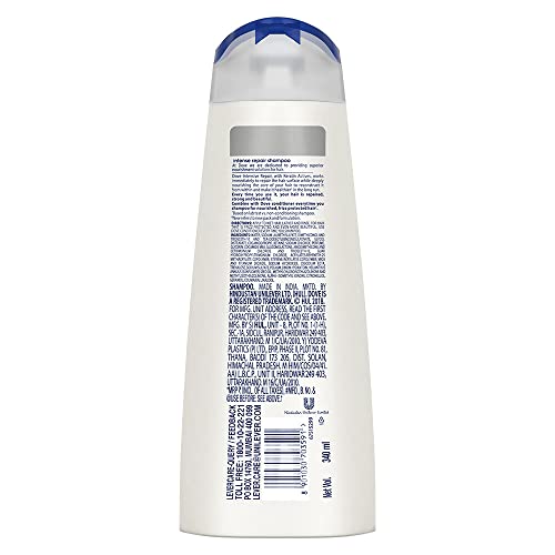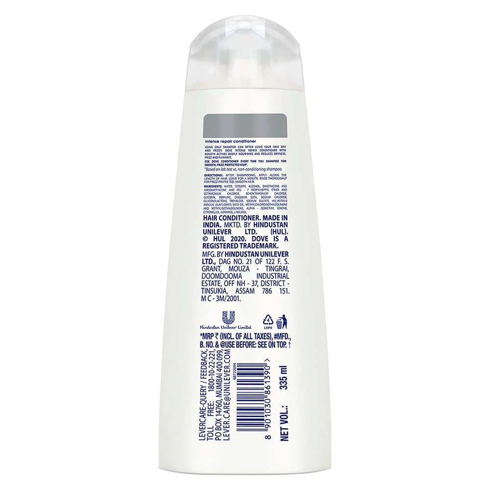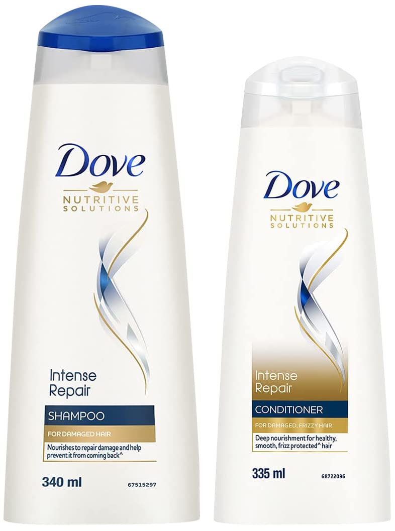 Dove Intense Repair Hair Conditioner 340 ml With Keratin Actives to Smoothen Dry and Frizzy Hair - Deep Conditioner for Damaged Hair for Men & WomenDoes your hair get frizzy and unmanageable? Are you left wishing for a remedy to fix your frizzy tassels? Do you want to know the secret to fixing frizzy hair? Try New Dove Intense Repair Conditioner. Control frizz with a nourishing conditioner thatâs formulated to nourish and help with frizz prevention. Formulated with Keratin Actives Dove Intense Repair Conditioner helps to nourish dry and frizzy hair with two-way care. It controls external signs of dryness in the form of frizz while nourishing strands to help them look their best. This conditioner for frizzy damaged hair leaves hair visibly smooth and more manageable â giving you smoother hair* that you will be proud of. Use it after your shampoo on damp hair for best results. This nourishing conditioner works immediately to smoothen the hair surface deeply nourishing to moisturize hair strands for healthier looking and smoother*hair use Dove repair conditioner. With every use youâll be left with shiny and beautiful hair. Buy New Dove Intense Repair conditioner and treat your hair to a look that will be the cause of envy among all your friends. Dove Conditioners for 100% care. *Based on lab test with Dove Intense Repair system vs non-conditioning shampooDove Intense Repair Shampoo 340 ml Repairs Dry and Damaged Hair Strengthening Shampoo for Smooth & Strong Hair - Mild Daily Shampoo for Men & WomenIs your hair showing signs of damage â split ends dryness roughness or hair fall. The secret of how to repair damaged hair. A strengthening shampoo that helps to treat the signs of damage with two-way care for both long and short-term results . Give your hair the essential care it deserves with Dove intense repair shampoo. The intense repair shampoo works to restore the health and shine of your hair. It contains fibre actives which penetrate your hair and rebuild damaged hair to renew the lost gloss and vigour and give life to your damaged hair. Gentle enough for daily use Dove intense repair shampoo helps to immediately repair strands while nourishing them from within for healthy looking hair thatâs stronger this shampoo for damaged hair repairs signs of damage for smooth and strong hair. Formulated with fibre actives this shampoo for damaged hair reinforces strands to prevent the signs of damage on hair. Nourishment for damaged hair to leave you with beautiful looking hair all day long. Based on lab test with Dove intense repair system vs non-conditioning shampoo strength against hair breakage based on lab test with Dove intense repair system vs. Non-conditioning shampoo. How to use :Completely soak your hair and massage your shampoo gently over your scalp. Rinse it out well. Usually rinse and repeat? For daily shampooing the rinse and repeat rule isn't actually necessary (unless you've been trigger-happy with the hairspray) so just once will do. Try this : To keep that damage repair going make sure you use a conditioner that works with your shampoo too. Our Intensive Repair Conditioner will help to prevent breakages and leave your hair looking and feeling instantly nourished and beautiful. Ingredients : Ingredients Water Sodium Laureth Sulfate Dimethiconol and Trideceth-10 and TEA-Dodecylbenzenesulfonate Glycol Distearate Cocamidopropyl Betaine Sodium Chloride Perfume Glycerin Cocamide MEA Amodimethicone and Cetrimonium Chloride and Trideceth-12 Guar Hydroxypropyltrimonium Chloride Acrylates/Beheneth-25 Methacrylate Copolymer Styrene/Acrylates Copolymer Mica and Titanium Dioxide Sodium Hydroxide Disodium EDTA Gluconolactone Trehalose Adipic Acid Sodium Sulfate PEG-45M DMDM Hydantoin Helianthus Annuus (Sunflower) Seed Oil Methylchloroisothiazolinone and Methylisothiazolinone Alpha-Isomethyl Ionone Citronellol Geraniol Linalool.