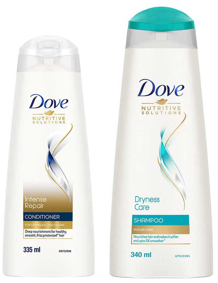 Dove Intense Repair Hair Conditioner With Keratin Actives to Smoothen Dry and Frizzy Hair - Deep Conditioner for Damaged Hair for Men & Women 335MLDoes your hair get frizzy and unmanageable? Are you left wishing for a remedy to fix your frizzy tassels? Do you want to know the secret to fixing frizzy hair? Try New Dove Intense Repair Conditioner. Control frizz with a nourishing conditioner thatâs formulated to nourish and help with frizz prevention. Formulated with Keratin Actives Dove Intense Repair Conditioner helps to nourish dry and frizzy hair with two-way care. It controls external signs of dryness in the form of frizz while nourishing strands to help them look their best. This conditioner for frizzy damaged hair leaves hair visibly smooth and more manageable â giving you smoother hair* that you will be proud of. Use it after your shampoo on damp hair for best results. This nourishing conditioner works immediately to smoothen the hair surface deeply nourishing to moisturize hair strands for healthier looking and smoother*hair use Dove repair conditioner. With every use youâll be left with shiny and beautiful hair. Buy New Dove Intense Repair conditioner and treat your hair to a look that will be the cause of envy among all your friends. Dove Conditioners for 100% care. *Based on lab test with Dove Intense Repair system vs non-conditioning shampooDove Dryness Care Shampoo 340 ml With Pro-Moisture Complex for Dry Hair & Scalp Gives Soft Smooth Damage Free Hair - Daily Shampoo for Men & WomenHarsh humid weather taking a toll on your beautiful hair causing damage with every passing day? Guard your hair against harsh weather. Crafted from a perfect blend of ingredients the shampoo helps to restore hair softness and smoothness. To help prevent daily hair damage Dove Nutritive Solutions Dryness Care Shampoo nourishes normal and dry locks for healthy looking hair. The shampoo cleans your dry locks and gives it a shiny and glossy look. The specially designed formula of this dryness care shampoo is perfect for days when your dry hair needs help. Dove Dryness Care Shampoo is just what you need for smooth and bouncy hair! This moisturizing and nourishing shampoo helps to protect hair from damage for silky soft locks. Uniquely formulated with Pro-Moisture Complex this Dove shampoo nourishes hair strands from within. Dove Dryness Care Shampoo nourishes hair with each application for strong hair thatâs manageable and healthy looking. Gently massage this shampoo into your scalp to create a lather and rinse well. After wash this shampoo makes your hair look glossy and locks dryness of your hair. Smooth soft and more resilient to daily damage from grooming and brushing beautiful hair is just one wash away with this nourishing shampoo.