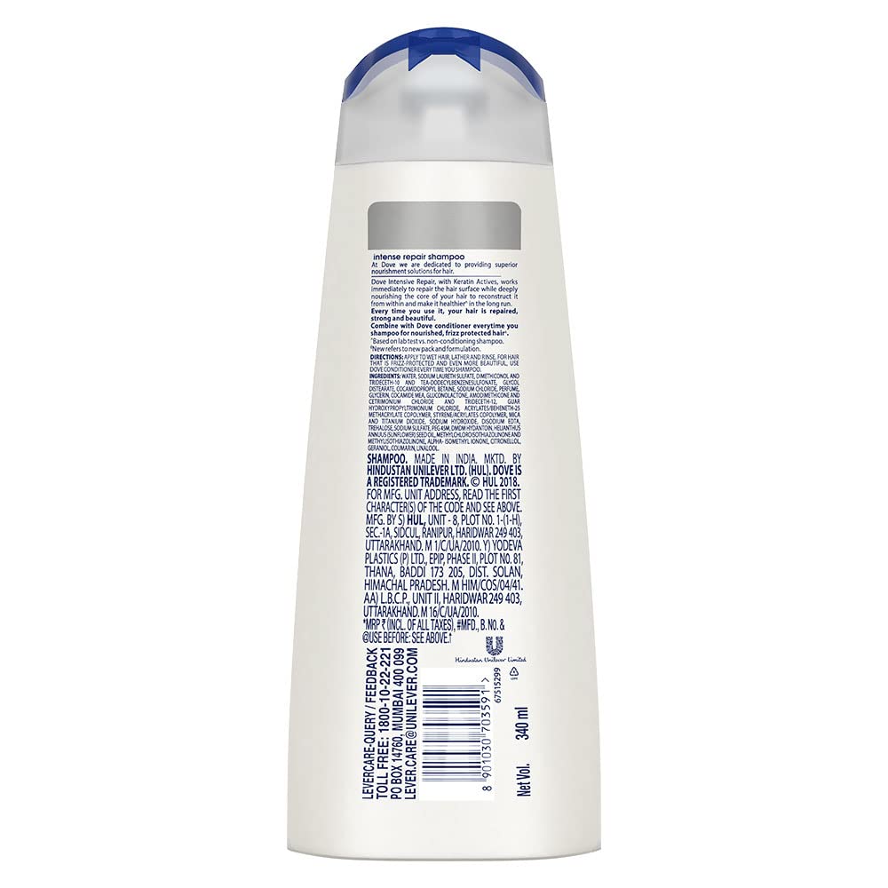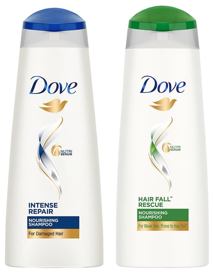 Dove Intense Repair Shampoo 340 ml Repairs Dry and Damaged Hair Strengthening Shampoo for Smooth & Strong Hair - Mild Daily Shampoo for Men & WomenIs your hair showing signs of damage â split ends dryness roughness or hair fall. The secret of how to repair damaged hair. A strengthening shampoo that helps to treat the signs of damage with two-way care for both long and short-term results . Give your hair the essential care it deserves with Dove intense repair shampoo. The intense repair shampoo works to restore the health and shine of your hair. It contains fibre actives which penetrate your hair and rebuild damaged hair to renew the lost gloss and vigour and give life to your damaged hair. Gentle enough for daily use Dove intense repair shampoo helps to immediately repair strands while nourishing them from within for healthy looking hair thatâs stronger this shampoo for damaged hair repairs signs of damage for smooth and strong hair. Formulated with fibre actives this shampoo for damaged hair reinforces strands to prevent the signs of damage on hair. Nourishment for damaged hair to leave you with beautiful looking hair all day long. Based on lab test with Dove intense repair system vs non-conditioning shampoo strength against hair breakage based on lab test with Dove intense repair system vs. Non-conditioning shampoo. How to use :Completely soak your hair and massage your shampoo gently over your scalp. Rinse it out well. Usually rinse and repeat? For daily shampooing the rinse and repeat rule isn't actually necessary (unless you've been trigger-happy with the hairspray) so just once will do. Try this : To keep that damage repair going make sure you use a conditioner that works with your shampoo too. Our Intensive Repair Conditioner will help to prevent breakages and leave your hair looking and feeling instantly nourished and beautiful. Ingredients : Ingredients Water Sodium Laureth Sulfate Dimethiconol and Trideceth-10 and TEA-Dodecylbenzenesulfonate Glycol Distearate Cocamidopropyl Betaine Sodium Chloride Perfume Glycerin Cocamide MEA Amodimethicone and Cetrimonium Chloride and Trideceth-12 Guar Hydroxypropyltrimonium Chloride Acrylates/Beheneth-25 Methacrylate Copolymer Styrene/Acrylates Copolymer Mica and Titanium Dioxide Sodium Hydroxide Disodium EDTA Gluconolactone Trehalose Adipic Acid Sodium Sulfate PEG-45M DMDM Hydantoin Helianthus Annuus (Sunflower) Seed Oil Methylchloroisothiazolinone and Methylisothiazolinone Alpha-Isomethyl Ionone Citronellol Geraniol Linalool.Dove Hair Fall Rescue Shampoo For Weak Hair 180 mlWe love the feeling of beautiful hair â but daily hair damage can leave your hair prone to breakage. Let hair fall* be an issue of the past! Use the Hair Fall* Rescue Shampoo from Dove regularly to get thick and luscious looking hair as the Dove shampoo works to reduce hair fall by up to 98%*. Specially formulated for better hair fall* control Dove Nutritive Solutions Hair Fall* Rescue Shampoo strengthens and nourishes fragile hair from roots up. Perfect as a daily hair fall* solution this unique formula fortifies strands to reduce hair fall*. Enriched with Nutrilock Actives our best shampoo for hair fall* immediately helps seal cuticles and strengthens strands to help minimize hair fall due to breakages leaving them looking fuller**. Healthier looking hair means lesser breakage and reduced hair fall*! Buy Dove Hair Fall Rescue Shampoo and forget your hair fall* troubles. Leaves your hair feeling strong and beautiful day after day. Say no to hair fall* worries and do more in life. Dove Hair Fall* Rescue lets you be stronger bolder and closer every day.*Hair fall refers to hair breakage**Hairfall due to breakage Based on a lab test with Dove Hair Fall Rescue System vs non-conditioning shampoo