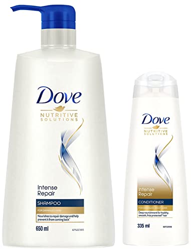 Dove Intense Repair Hair Shampoo 650 ml Repairs Dry and Damaged Hair Moisturizing Shampoo for Smooth & Strong Hair - Mild Shampoo for Women & MenIs your hair showing signs of damage â split ends dryness roughness or hair fall? The secret of how to repair damaged hair? A strengthening shampoo that helps to treat the signs of damage with two-way care for both long and short-term results*. Give your hair the essential care it deserves with Dove Intense Repair Shampoo. The Intense Repair Shampoo works to restore the health and shine of your hair. It contains Fibre Actives which penetrate your hair and rebuild damaged hair to renew the lost gloss and vigour and give life to your damaged hair. Gentle enough for daily use Dove Intense Repair Shampoo helps to immediately repair strands while nourishing them from within for healthy looking hair thatâs stronger** Dove Intense Repair Shampoo for damaged hair repairs signs of damage for smooth and strong hair. Dove Intense Repair Shampoo formulated with Fibre Actives this shampoo for damaged hair reinforces strands to prevent the signs of damage on hair. Nourishment for damaged hair to leave you with beautiful looking hair all day long. *Based on lab test with Dove Intense Repair system vs non-conditioning shampoo **Strength against hair breakage based on lab test with Dove Intense Repair system vs. non-conditioning shampoo. Ingredients Water Sodium Laureth Sulfate Dimethiconol and Trideceth-10 and TEA-Dodecylbenzenesulfonate Glycol Distearate Cocamidopropyl Betaine Sodium Chloride Perfume Glycerin Cocamide MEA Amodimethicone and Cetrimonium Chloride and Trideceth-12 Guar Hydroxypropyltrimonium Chloride Acrylates/Beheneth-25 Methacrylate Copolymer Styrene/Acrylates Copolymer Mica and Titanium Dioxide Sodium Hydroxide Disodium EDTA Gluconolactone Trehalose Adipic Acid Sodium Sulfate PEG-45M DMDM Hydantoin Helianthus Annuus (Sunflower) Seed Oil Methylchloroisothiazolinone and Methylisothiazolinone Alpha-Isomethyl Ionone Citronellol Geraniol Linalool.Dove Intense Repair Hair Conditioner 340 ml With Keratin Actives to Smoothen Dry and Frizzy Hair - Deep Conditioner for Damaged Hair for Men & WomenDoes your hair get frizzy and unmanageable? Are you left wishing for a remedy to fix your frizzy tassels? Do you want to know the secret to fixing frizzy hair? Try New Dove Intense Repair Conditioner. Control frizz with a nourishing conditioner thatâs formulated to nourish and help with frizz prevention. Formulated with Keratin Actives Dove Intense Repair Conditioner helps to nourish dry and frizzy hair with two-way care. It controls external signs of dryness in the form of frizz while nourishing strands to help them look their best. This conditioner for frizzy damaged hair leaves hair visibly smooth and more manageable â giving you smoother hair* that you will be proud of. Use it after your shampoo on damp hair for best results. This nourishing conditioner works immediately to smoothen the hair surface deeply nourishing to moisturize hair strands for healthier looking and smoother*hair use Dove repair conditioner. With every use youâll be left with shiny and beautiful hair. Buy New Dove Intense Repair conditioner and treat your hair to a look that will be the cause of envy among all your friends. Dove Conditioners for 100% care. *Based on lab test with Dove Intense Repair system vs non-conditioning shampoo