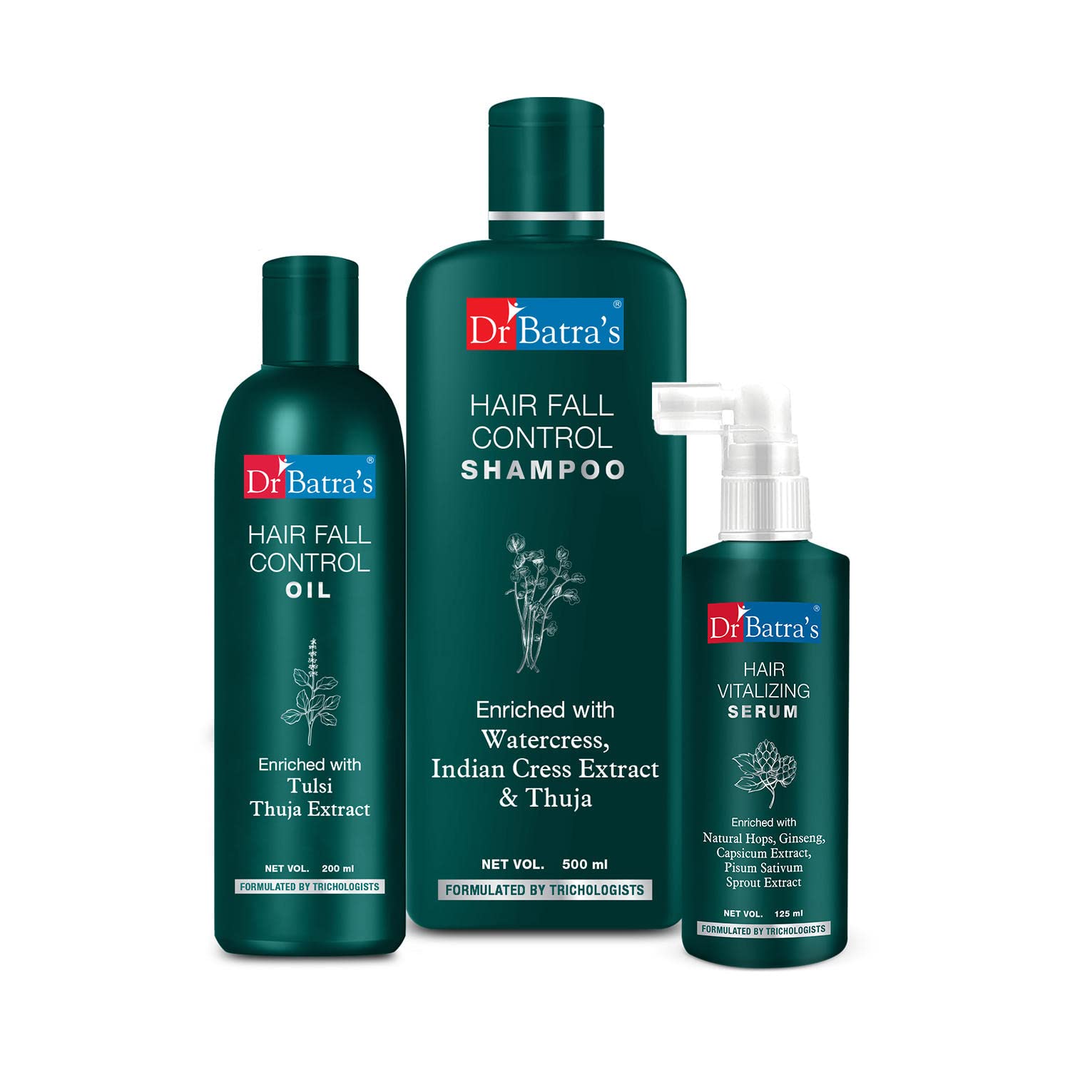 Dr Batra's Hair Vitalizing Serum is a blend of natural extracts like Thuja occidentalis which helps to inhibit DHT thus reducing the of hair . Hops rich in vitamins and amino acids help in hair growth. Dr Batra's Hair Fall Control Shampoo made with natural extracts is the best mild shampoo for hair fall control. Strengthened with Thuja occidentalis (white cedar) it helps to inhibit DHT thus reducing the of hair . Watercress & Indian Cress extracts strengthen the hair follicles from root to tip thereby arresting hair fall. Capsicum extract helps to accelerate the growth of new hair. Ginseng protects the scalp from the harmful effects of the environment. Enriched with Amla Dr Batra's Hair Fall Control Shampoo naturally conditions the hair to improve overall texture and provides nourishment from root to tip. It is free from paraben sulfate & silicon which makes it suitable for all types of hair. Dr Batra's Hair Fall Control Oil is a specially formulated non-sticky hair oil with natrual ingredients like Thuja Brahmi and Tulsi extracts to control hair fall. Thuja occidentalis (white cedar) helps to inhibit DHT thus reducing the of hair . Brahmi provides deep nourishment and enhances overall hair texture. Tulsi extracts improve scalp health thereby supporting hair regrowth. This hair falls control oil provides your hair with the goodness of natural ingredients leaving hair stronger from the inside and shinier on the outside.
