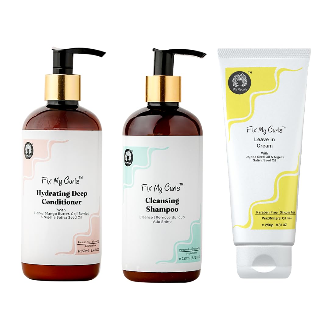 Fix My Curls Hair Care Curl Defining 3-Step Kit | Sulfate-Free Cleansing Shampoo, Hydrating Conditioner & Leave-In Cream | For Naturally Curly, Wavy & Frizzy Hair | Enriched with Tea Tree| 250ml Each