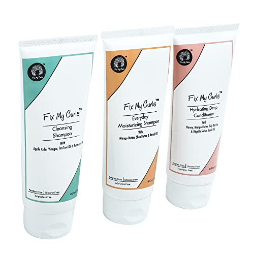Fix My Curls Travel sized Wash Day Bundle with Cleansing Shampoo Everyday Moisturizing Shampoo & Hydrating Deep Conditioner Cruelty Free SIlicone & Sulphate Free Frizz Control Solution (50ml each)