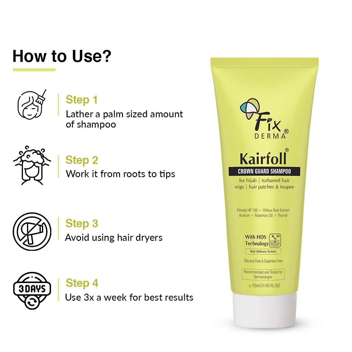 FIXDERMA Kairfoll Rosemary Oil Shampoo For Hair Growth|Crown Guard Shampoo For HijabTurbaned Hair&Wigs|Hair Patches&Toupee|Shampoo For Women&Men|Sulphate And Paraben Free Shampoo - 15 Ml