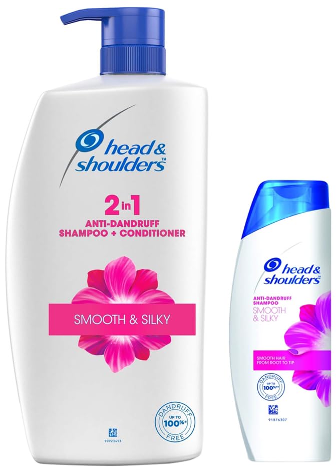 Head & Shoulders 2-In-1 Smooth & Silky Anti Dandruff Shampoo + Conditioner For Women & Men 1LFor the first time in India the Head and Shoulders 2-in-1 range is specially formulated to have all the dandruff fighting power you expect while combining the benefits of both shampoo and conditioner in one bottle. It makes your hair upto 100% dandruff free and surprisingly smooth.Head & Shoulders Anti Dandruff Shampoo Smooth & Silky 180 ML WhiteGo from dry and frizzy hair to smooth and silky hair in just one wash. Head & Shoulders Smooth & Silky Anti-Dandruff Shampoo is formulated with added moisturizers to cleanse and restore dry frizzy hair and leave you with dandruff free hair*. Go ahead run your hands through your hair again. (*visible flakes only with regular use) - 24 hour frizz control for smooth beautiful-looking hair - Gentle pH balanced formula for everyday use even on color treated hair"