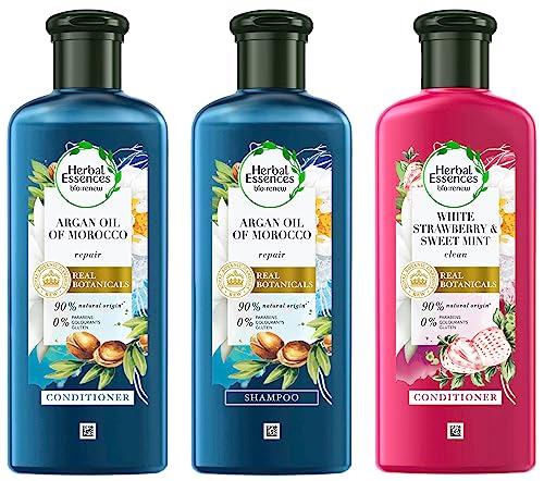 Herbal Essences White Strawberry & Sweet Mint CONDITIONER- For Cleansing and Volume - No Paraben No Colorants 240 MLGently condition hair with Herbal Essences bio:renew WHITE STRAWBERRY & SWEET MINT CONDITIONER to leave it voluminous and vibrant. Crafted with bio:renew our signature blend of essential antioxidants aloe and sea kelp WHITE STRAWBERRY & SWEET MINT CONDITIONER also helps purify and protect against impurities to bring your hair back to life. Free of parabens gluten and colorants WHITE STRAWBERRY & SWEET MINT CONDITIONER gently conditions as it infuses crisp notes of white strawberry delicate jasmine and invigorating mint into your hair.Herbal Essences Moroccan Argan oil Shampoo for Frizz Free Soft Hair. With Argan Oil for Hair. Paraben Free240mlRepair damaged hair with Herbal Essences bio:renew ARGAN OIL OF MOROCCO SHAMPOO to leave it smoother and softer with every wash.Crafted with bio:renew our signature blend of essential antioxidants aloe and sea kelp ARGAN OIL OF MOROCCO SHAMPOO will leave your hair shining brighter feeling repaired and having freedom from frizz to bring it back to life in just 21 days. Free of parabens gluten and colorants from the first pop of the cap it will take you on a multi-layered scent experience to the warm sands of Morocco. Immerse yourself in the scent of creamy vanilla followed by a burst of fizzy citrus and lingering exotic spices.Herbal Essences Argan Oil of Morocco CONDITIONER- For Hair Repair and No Frizz- No Paraben No Colorants 240 MLRepair damaged hair with Herbal Essences bio:renew ARGAN OIL OF MOROCCO CONDITIONER to leave it smoother and softer.Crafted with bio:renew our signature blend of essential antioxidants aloe and sea kelp ARGAN OIL OF MOROCCO CONDITIONER will leave your hair shining brighter feeling repaired and having freedom from frizz to bring it back to life in just 21 days. Free of parabens gluten and colorants from the first pop of the cap it will take you on a multi-layered scent experience to the warm sands of Morocco. Immerse yourself in the scent of creamy vanilla followed by a burst of fizzy citrus and lingering exotic spices. Usage Instructions: Apply generously to wet hair from root to tip & rinse.