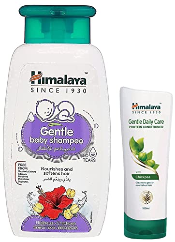 Himalaya Gentle Baby Shampoo (200ml)Himalaya Gentle Baby Shampoo (200ml) Natural Care for Your Baby's Hair Himalaya Herbals baby care shampoo is enriched with natural sources of protein that leave your baby's hair soft and nourished. This gentle baby shampoo is formulated to cleanse and strengthen your little one's hair without any teary-eyed blues. It is so gentle that your tot is definitely going to love it. Himalaya shampoo is in essence a natural shampoo containing no harsh chemicals. It boasts anti-inflammatory and soothing properties to protect and care for your baby's tender scalp. All in all it is an essential baby care product that helps you get rid of dirt and other harmful infectious particles from your child's scalp without damaging it. Gentle Baby Shampoo for Healthy Baby Tresses The mild and soft Himalaya herbal shampoo moisturises and nourishes your baby's hair improving its texture. Its core ingredients include chickpea hibiscus and khus khus. The protein-rich chickpea leaves the hair strong and shiny while hibiscus acts as a natural conditioner to make it soft and smooth. Khus-khus soothes the baby's scalp with its antibacterial and antifungal properties. These natural ingredients make Himalaya baby care shampoo perfectly safe for daily use. It cleanses disinfects and leaves behind a mild scent and lustre with its ideal pH balance. Easy to use just apply this Himalaya 200ml Gentle Baby Shampoo lather and rinse well to get those shiny baby locks instantly. Brand: Himalaya Age: Newborn and up Contains: Chickpea Hibiscus and Khus khus for smooth silky hair Antibacterial and antifungal properties Hypoallergenic Paediatrician recommended Content: 200 mlHimalaya Gentle Daily Care Protein Conditioner | Daily Use Mild Conditioner for Detangled & Silky Smooth Hair | Nourishes Dry Hair | With China Rose Lotus Chickpea & Oats | For Women & Men | 100 mlHimalaya Gentle Daily Care Protein Conditioner effectively moisturizes dry rough damaged hair & makes them detangled soft manageable shiny & smooth. A unique blend of 4 protein-rich herbs ensures that your hair is left soft & shiny even upon daily use. It effectively treats damaged hair caused by everyday activities such as hair straightening brushing colouring chemical treatment etc. China Rose & Lotus are effective hair & scalp conditioners that softens your hair thus improving manageability. Chickpea and Oats are rich sources of natural protein that repair & nourish the hair. It is a gentle daily use conditioner that detangles softens nourishes and naturally moistens your hair. For best results use Himalaya Gentle Daily Care Daily Protein Conditioner for daily protection against dry & damaged hair.