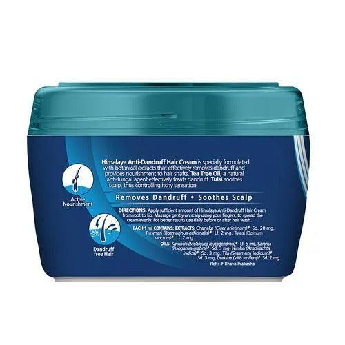 Himalaya Herbals Anti-Dandruff Hair Cream:Himalaya Herbals Anti-Dandruff Hair Cream helps to keeps your hair nourished and moisturized and also removes dandruff. It strengthens hair root, promoting hair growth, make your hair look healthier, soft and supple.Ingredients:Made from rich collection of natural and herbal ingredients, Key ingredients of Himalaya Herbals Anti-Dandruff Hair Cream is:Melaleuca leucadendron (Tea Tree Oil)Ocimum tenuiflorum (Tulsi, Holy basil)Coriandrum sativum (Dhanyaka)Rosmarinus officinalis (Rosemary, Rusmari)Benefits:Himalaya Herbals Anti-Dandruff Hair Cream may be useful for:Strengthens the hair rootRemoves dandruffProtect from scalp infectionNourishes scalpSoothes an itchy and flaky scalpHow to Use:Massage Anti-Dandruff Hair Cream gently into the scalp using a circular motion.Use regularly before and after shampooing to maintain dandruff-free, soft and healthy hair.For best results, shampoo hair with Himalaya's Anti-Dandruff Shampoo.Suitable for all hair types.Legal Disclaimer: Product images are for illustrative purposes only. Images/packaging/ labels may vary from time to time due to the manufacturer's manufacturing batch and location changes. The product description is for information purposes only and may contain additional ingredients