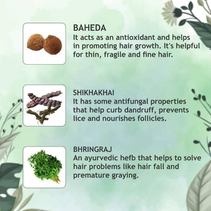 Jeevanras Mukti Gold Herbal HairwashMukti Gold Hairwash is a herbal shampoo that strengthens the hair while leaving it soft and bouncy. It has a cell repair formula, which repairs the hair quality and helps in rescuing the hair roots. It helps in maintaining long, lovely, and strong hair. It is very effective in controlling dandruff if used with Mukti Gold Juice Oil for HairCombination of herbs:Amla, Harar, Coconut, Shikakai, Nagarmotha, Brahmi, Neem, Bawachi, Amba, Arjun, Bhringraj, Rose, Jamul chal, Bahera, Belpatra, and Reetha as the foaming agent.Legal Disclaimer: Product images are for illustrative purposes only. Images/packaging/ labels may vary from time to time due to changes made by the manufacturer's manuf