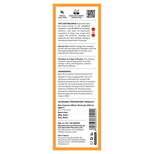 Papaya is one of natures greatest gifts to humans from the ayurvedic point of view.We bring you its nourishing and rejuvenating properties in the form of Jiva Papaya Shampoo.The shampoo is balanced to control the pH parameters of your hair and scalp to give optimum growth environment.It cleanses the hair roots and nourishes the follicles.It keeps your scalp free of impurities and infections.Get a flawless silky hair now.And feel its freshness and mesmerizing fragrance that last the whole day.