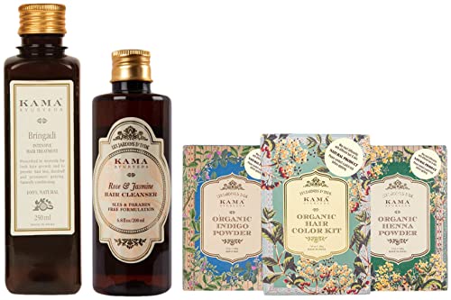 Kama Ayurveda Natural Organic Hair Color Kit & Kama Ayurveda Bringadi Intensive Hair Treatment Oil, 200ml& Kama Ayurveda Rose & Jasmine Hair Cleanser with Hibiscus, 200ml