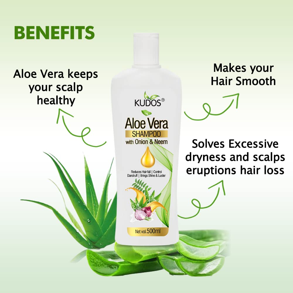 Introducing the Kudos Aloe Vera and Onion Shampoo - a dynamic duo designed to transform your hair care routine and leave your locks feeling revitalized and radiant. This pack includes two generously sized 500ml bottles ensuring you have an ample supply of these powerful formulations for a long-lasting hair care experience. Kudos Aloe Vera Shampoo: Enriched with the soothing and hydrating properties of Aloe Vera this shampoo provides a gentle yet effective cleanse for your hair. Aloe Vera is renowned for its ability to nourish and moisturize the scalp promoting a healthier environment for hair growth. This formula helps to restore natural shine leaving your hair feeling soft and manageable. Experience the refreshing sensation of Aloe Vera as it works its magic creating a spa-like experience with every wash. Kudos Onion Shampoo: Harness the power of nature with the Kudos Onion Shampoo. Packed with the goodness of onions this shampoo is specially formulated to address common hair concerns. Onions are known for their rich sulfur content which supports hair strength and reduces breakage. This shampoo helps to cleanse the scalp removing excess oil and impurities while nourishing the hair follicles. The result? Stronger healthier hair that looks and feels revitalized. Embrace the natural benefits of onions for a hair care routine that goes beyond the ordinary. Key Features: Hydration and Nourishment: Aloe Vera-infused formula hydrates and nourishes your hair leaving it feeling soft and rejuvenated. Strength and Vitality: Onion Shampoo strengthens hair and promotes vitality reducing breakage and improving overall hair health. Gentle Cleansing: Both shampoos provide a gentle yet effective cleanse removing impurities without stripping away essential oils. Refreshing Experience: Enjoy the refreshing and invigorating scents of Aloe Vera and Onion creating a spa-like experience in the comfort of your own shower.