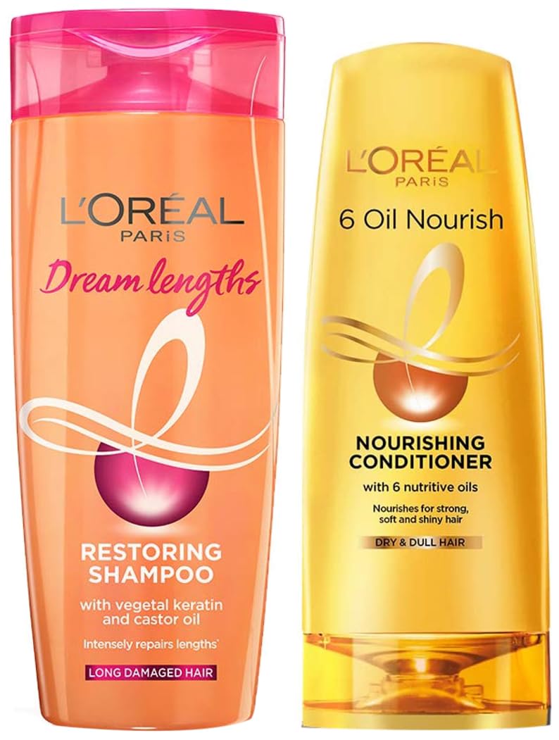 L'Oreal Paris 6 Oil Nourish Conditioner 175ml (With 10% Extra)The 6 Oil Nourish Conditioner a first of its kind from L'Oreal Paris can be used on the scalp. This conditioner provides complete nourishment to your hair giving it the six benefits of the oils used. The L'Oreal Paris 6 Oil Nourish Conditioner is the first of its kind that can be applied on the scalp giving your hair the nourishment it deserves. L'Oreal Paris 6 Oil Nourish Conditione hydrates and nourishes to transform dry lifeless hair to soft and lustrous in just one wash with our expert hair oil system. Hair is sumptuously soft lightweight and brilliantly shiny. For best results use 6 Oil Nourish shampoo and conditioner together.L'Oreal Paris Shampoo Nourishes Repair & Shine For Long and Lifeless Hair Dream Lengths 192.5mlLonging for luscious lengths? Then dream no longer! L'Oreal Paris Dream Lengths conditioner is designed to hydrate and detangle damaged dry and over-processed long hair. Enriched with Keratin Vitamins B3 and B5 and Caster Oil; it leaves your locks looking shiny smooths split ends and protects from breakage.