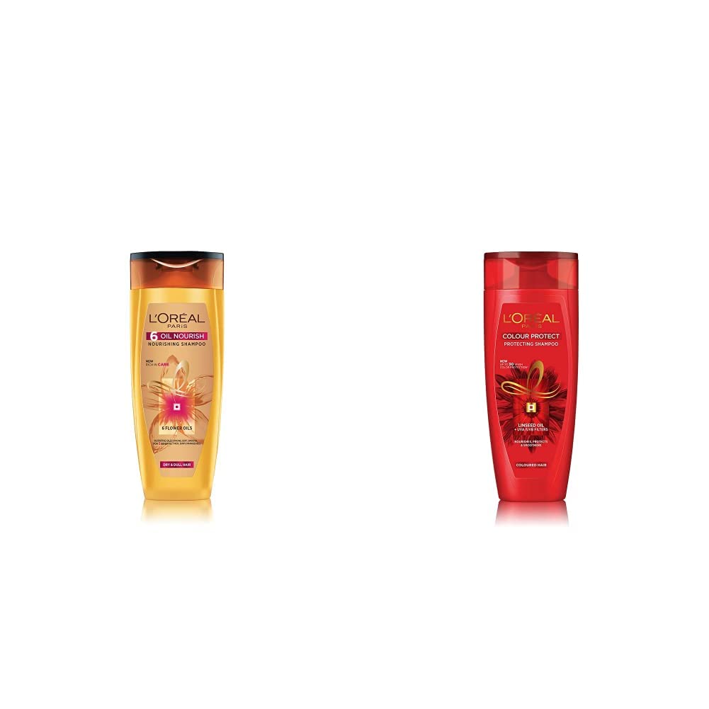 L'Oreal Paris 6 Oil Nourish Shampoo 360ml (With 10% Extra)L'Oreal Paris 6 Oil Nourish Shampoo has been created to provide complete nourishment to your hair from root to tip with six micro oils™ making it soft shiny thick strong smooth and manageable. Pamper your hair with the 6-Oil Nourish Shampoo personalized for your hair type. Science meets tradition with the infusion of 6 unique oils - Argan Almond Jojoba Olive Coconut and Camelina. Penetrates deep into the scalp giving it utmost nourishment and care that is suitable for all hair types. L'Oreal Paris helps to revive all forms of hair damage. Whether it’s from heat styling color processing or dryness L'Oreal Paris has powerful treatments formulated with superior technology.L'Oreal Paris Color Protect Shampoo 360ml (With 10% Extra)Protect your coloured hair with L'Oreal Paris Hair Expertise Colour Protect Shampoo. L'Oreal one of the most reputed beauty care brands in the world has prepared this shampoo to protect your hair from the harmful effects of pollution and sunrays. This specially formulated shampoo from the house of L'Oreal is prepared to give a soft and silky feel to your coloured hair. The UV filter light reflecting system of this shampoo not only cleans your coloured hair but provides a two level nourishment to your hair. The experts of L'Oreal has formulated this shampoo in such a way that will give your dry hair a soft look without fading its colour. This non-sulphate shampoo gives a deep moisturising to your coloured hair. ThisL'Oreal Paris shampoo helps to enhance the colour radiance and also protects your hair. Thiscolour protect shampoo of L'Oreal comes in a smart reddish container. This helps to carry it with comfort while travelling. To facilitate the use designers have provided a flip top cap with this shampoo. This smart design of the container helps prevent the misuse of the product. If you are looking for a complete hair cleaning and hair care solution for your coloured hair then the L'Oreal ParisHair Expertise Colour Protect Shampoo is perfectly suited for you. Key features of L'Oreal Paris Hair Expertise Colour Protect Shampoo UV filter reflecting system gives a two level nourishment to your coloured hair Softens your coloured hair without fading colour Protects hair fibre from external damages Non-sulphate composition gives a problem free soft hair