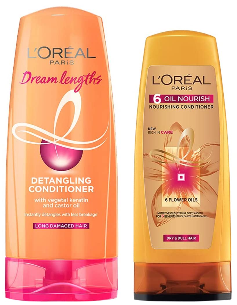 L'Oreal Paris 6 Oil Nourish Conditioner 175ml (With 10% Extra)The 6 Oil Nourish Conditioner a first of its kind from L'Oreal Paris can be used on the scalp. This conditioner provides complete nourishment to your hair giving it the six benefits of the oils used. The L'Oreal Paris 6 Oil Nourish Conditioner is the first of its kind that can be applied on the scalp giving your hair the nourishment it deserves. L'Oreal Paris 6 Oil Nourish Conditione hydrates and nourishes to transform dry lifeless hair to soft and lustrous in just one wash with our expert hair oil system. Hair is sumptuously soft lightweight and brilliantly shiny. For best results use 6 Oil Nourish shampoo and conditioner together.L'Oreal Paris Dream Lengths Conditioner 192.5 mlSave the last 3 cms of your hair and get the long hair of your dreams with the new L'Oreal Paris Dream Lengths Detangling Conditioner. A perfect conditioner for dry and damaged hair the Dream Lengths Detangling Conditioner instantly detangles long hair for smoother hair with less breakage. Get rid of knots and tangles and achieve all your goals of soft smooth and shiny hair with this L'Oreal Conditioner. The vegetal keratin and vitamin B3 and B5 in this conditioner seals damaged tips while castor oil prevents hair breakage and promotes healthy growth for longer and stronger hair – a great conditioner for hair growth! Style twist and tie your hair without any worry with the new L'Oreal Paris Dream Lengths Detangling Conditioner. For best results and reduced hair breakage use after the L'Oreal Dream Lengths Restoring Shampoo and follow up with the L'Oreal Dream Lengths No Haircut Cream (Leave In Cream). How To Use?: Apply to wet hair from lengths to tips after shampooing. Leave the conditioner on for a few minutes and rinse thoroughly.