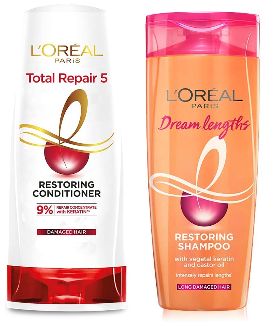 L'Oreal Paris Shampoo Nourishes Repair & Shine For Long and Lifeless Hair Dream Lengths 192.5mlLonging for luscious lengths? Then dream no longer! L'Oreal Paris Dream Lengths conditioner is designed to hydrate and detangle damaged dry and over-processed long hair. Enriched with Keratin Vitamins B3 and B5 and Caster Oil; it leaves your locks looking shiny smooths split ends and protects from breakage.L'Oreal Paris Total Repair 5 Restoring Conditioner with Keratin XS 192.5ml5 Problems.1 Solution. L'Oreal Paris Total Repair 5 Repairing conditioner helps fight against the five visible signs of damaged hair - Hair fall dryness roughness dullness and split ends without weighing it down. Damaged hair can lack the natural cement which keeps the hair strong and resilient. To ensure cohesion and strength the L'Oreal L**********s have created Ceramide-Cement technology to replicate the hair’s natural cement targetting the 5 problems. Explore our best hair products to revive and repair damaged hair. Highlights: 1. Helps fight against the five visible signs of damaged hair - hair fall dryness roughness dullness and split ends 2. Conditioner for damaged hair 3. With Protein + Ceramide 4. Fights the 5 signs of damage