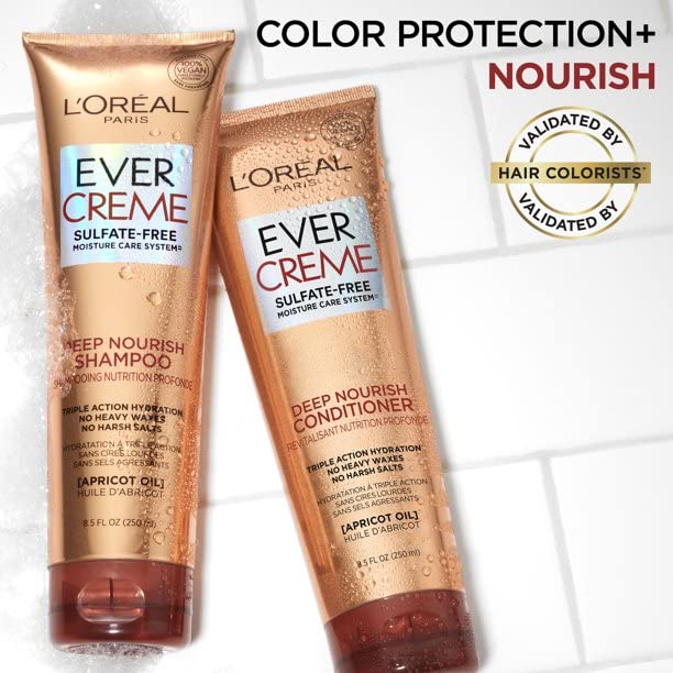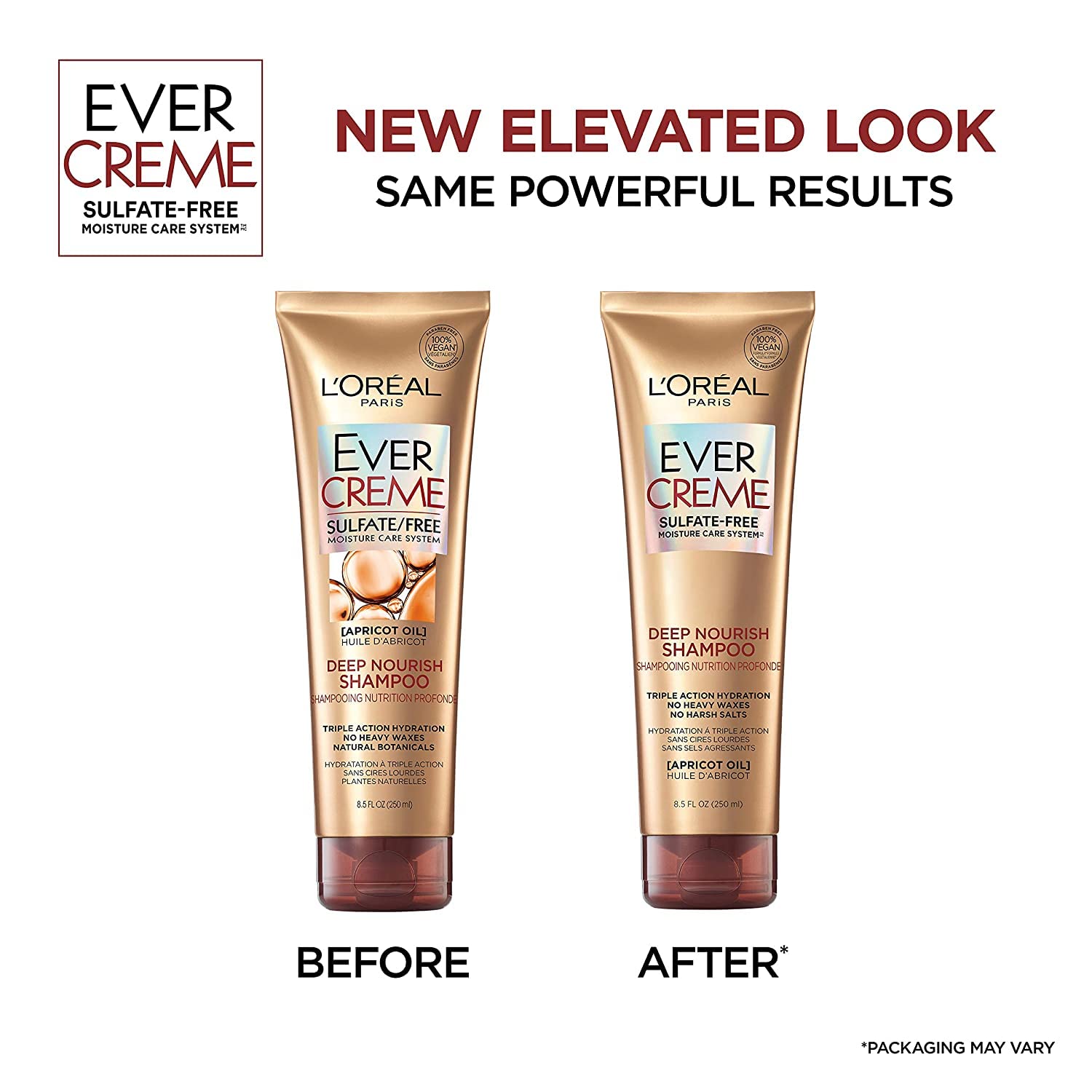 L'Oreal Paris EverCreme Deep Nourish Shampoo with apricot oil replenishes dry brittle hair with vital nourishment and deep moisture for silky-soft texture and healthy shine without weigh down. Hair looks healthier after the 1st use. Our shampoo for dry hair is especially gentle on color. There are no harsh sulfates salts or surfactants that can strip dull and damage hair. Experience a purely sensorial lush luxurious lather and a fresh aromatic fragrance that blooms. Ever our original 100% sulfate-free haircare. Pure respect for your hair.