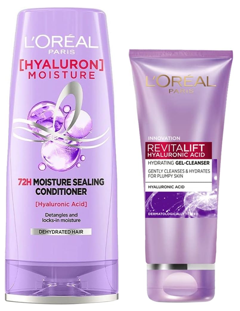 L'Oreal Paris Revitalift Gel Cleanser Gentle Cleansing and Hydration With Hyaluronic Acid 100 mlEnriched with powerful Hyaluronic Acid L'Oreal Paris Hyaluronic Acid Facewash gently cleanses & hydrates for plump skin. With ultra-fine foam that can penetrate pores this gentle cleanser thoroughly clears impurities and make-up. This gentle gel technology cleanses without drying out skin. Skin looks fresh and hydrated and over time; skin feels smooth plumped and youthful. Dermatologically tested and suitable for all skin types.L'Oreal Paris Hyaluron Moisture 72H Moisture Sealing Conditioner | With Hyaluronic Acid | For Dry & Dehydrated Hair | Adds Shine & Bounce 180mlTired of dry dull and lifeless hair? It’s time to hydrate your hair with intense moisture Try the all-new L'Oreal Paris Hyaluron Moisture Conditioner that provides long-lasting hydration and re-plumps hair with ease. This 72H Moisture sealing conditioner instantly locks-in moisture giving you shiny hair that’s full of life. Key Ingredient - Hyaluronic acid for hair which retains 1000 times its weight in water and is an essential ingredient to maintain the natural moisture barrier of your scalp and strands. This potent hydrating active weightlessly coats hair to keep it feeling hydrated for up to 72 hours and helps hair look visibly plumped bouncy and shiny. Now make the science of skincare a part of your hair care routine with Hyaluronic Acid. Instructions for usage: Use the L'Oreal conditioner for women post shampoo leave on for 2 mins and rinse. Instantly achieve detangled re-hydrated and plump hair.