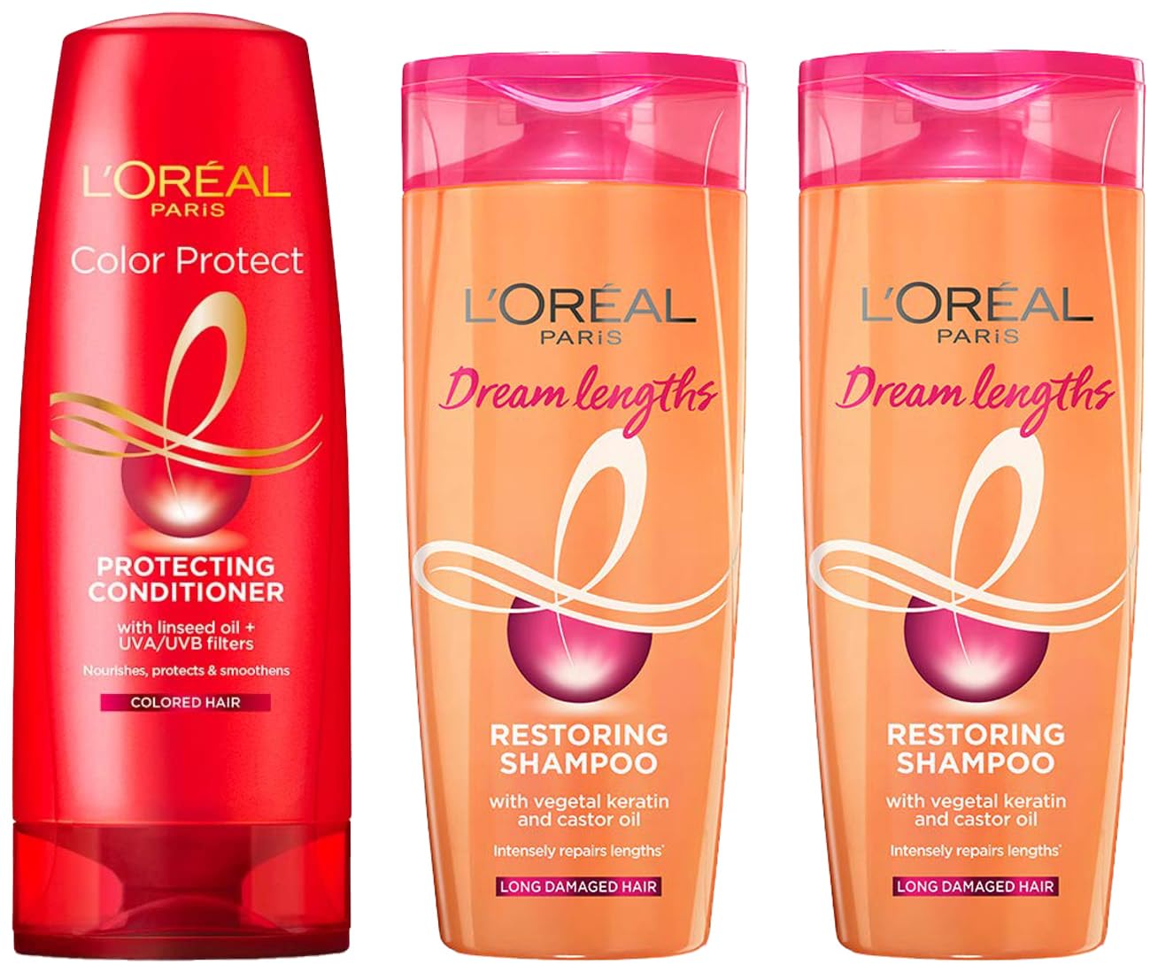 L'Oreal Paris Shampoo Nourishes Repair & Shine For Long and Lifeless Hair Dream Lengths 340 mlLonging for luscious lengths? Then dream no longer! L'Oreal Paris Dream Lengths conditioner is designed to hydrate and detangle damaged dry and over-processed long hair. Enriched with Keratin Vitamins B3 and B5 and Caster Oil; it leaves your locks looking shiny smooths split ends and protects from breakage.L'Oreal Paris Shampoo Nourishes Repair & Shine For Long and Lifeless Hair Dream Lengths 180mlLonging for luscious lengths? Then dream no longer! L'Oreal Paris Dream Lengths conditioner is designed to hydrate and detangle damaged dry and over-processed long hair. Enriched with Keratin Vitamins B3 and B5 and Caster Oil; it leaves your locks looking shiny smooths split ends and protects from breakage.L'Oreal Paris Conditioner Vibrant & Revived Colour For Colour-treated Hair Colour Protect 180mlEnhance and care for your coloured hair! L'Oreal Paris Colour Protect conditioner is designed to shield your colour treated hair from external aggressors whilst nurturing and caring from root to tip. Enriched with Active Nourishing technology UVA and UVB filters; locks are left feeling luscious to the touch looking shiny and smooth and with a more vibrant colour.