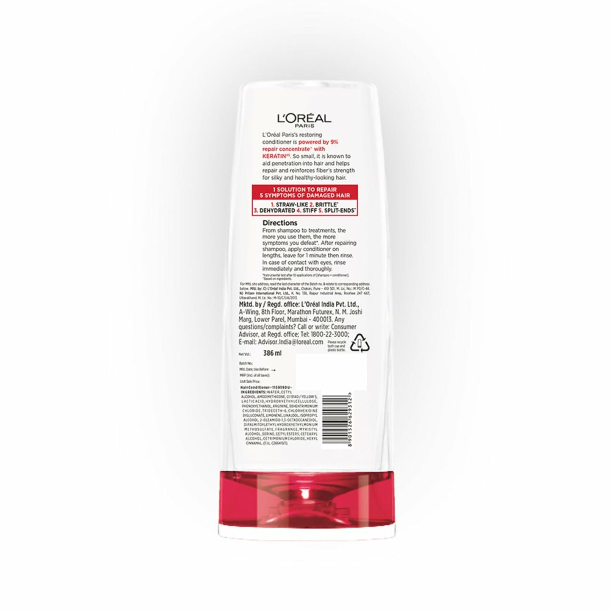 Revive your damaged hair today! L'Oréal Paris Total Repair 5 conditioner helps fight against the five visible signs of damaged hair: stiff strawlike split ends dehydrated and brittle hair. The Keratin XS conditioning formula reinforces each hair fibre to give strength and resilience to wear and tear; restoring smoothness and leaving it soft and healthy looking once again. Give new life to your locks with the Total Repair 5 range: Shampoo for a deep clean; Conditioner to restore moisture; and Serum to nourish and protect! All you need for damagefree beautiful hair!
