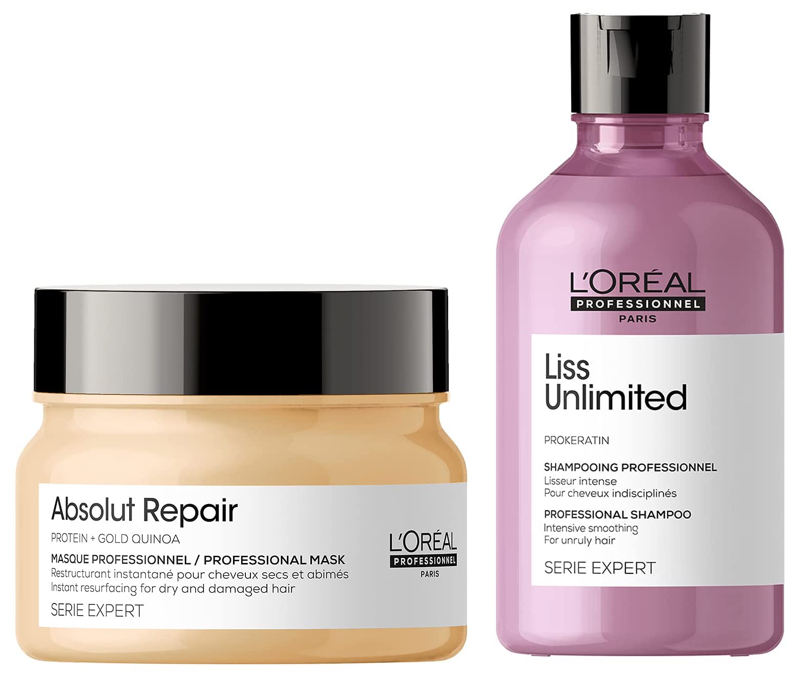 L'Oreal Professionnel Serie Expert Liss Unlimited Shampoo Smoothens hair controls frizz adds shine With Prokeratin complex & Serie Expert Absolut Repair Masque 250 gm For Dry and Damaged Hair