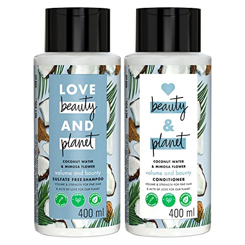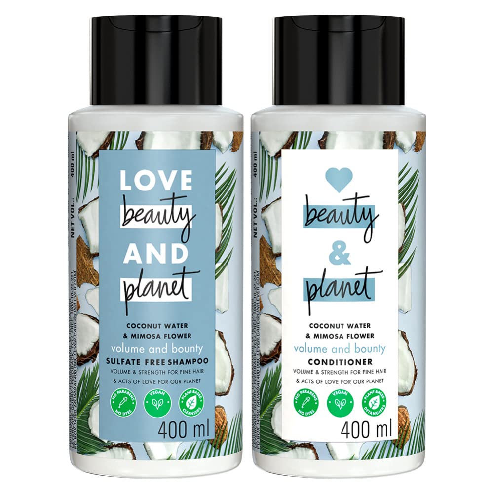 Love Beauty & Planet Volumizing Shampoo With Natural Coconut Water & Mimosa For Thin & Fine Hair No Parabens No Silicones 400 mlBuild bounce into your hair with our volume and bounty shampoo our volume shampoo is made with plant based cleansers and infused with organic coconut oil. Show off lush bountiful tresses with an energizing burst of delicate mimosa flower sourced ethically from the region of khemisset in morocco. How to use? Simply squeeze lather and rinse. Go easy on the tap after shampooing follow up with our love beauty and planet coconut water and mimosa flower volume and bounty conditioner. At love beauty and planet our goal is to make you more beautiful and give a little love to the planet. We are committed to small acts of love for the planet. Our goal is a carbon footprint so small it's like we weren't even here. We started our journey by loading our beauty products with goodness. Every one of our bottles is made from 100 percent recycled materials and are recyclable. Our caps and pumps aren't made from recycled plastics yet but we're working on it. No silicones no parabens no dyes no guilt. Yes vegan yes peta certified cruelty free. We are committed to small acts of love that make you and our planet a little more beautiful everyday. INGREDIENT: Aqua Cetearyl Alcohol Behentrimonium Chloride Cocos Nucifera Oil Parfum Dipropylene Glycol Acrylates/Beheneth-25 Methacrylate Copolymer Disodium EDTA Magnesium Nitrate Glycerin Sodium Hydroxide Cocos Nucifera Water Sodium Lauryl Sulfate Methylchloroisothiazolinone Magnesium Chloride Sodium Benzoate Methylisothiazolinone Hexyl Cinnamal Limonene Linalool.Love Beauty & Planet Natural Coconut Water & Mimosa Volumizing Conditioner For Thin & Fine Hair No parabens No Silicones 400 mlBuild bounce into your hair with our volume and bounty conditioner our volumizing conditioner is made with plant based cleansers and infused with organic coconut oil. Show off lush bountiful tresses with an energizing burst of delicate mimosa flower â sourced ethically from the region of khemisset in morocco. How to use? After shampooing spread through your gorgeous wet locks. Avoid the roots rinse. Go easy on the tap for brilliantly beautiful hair try our range of volumizing hair products starting with our love beauty and planet coconut water and mimosa flower volume and bounty shampoo. At love beauty and planet our goal is to make you more beautiful and give a little love to the planet. We are committed to small acts of love for the planet. Our goal is a carbon footprint so small it's like we weren't even here. We started our journey by loading our beauty products with goodness. Every one of our bottles is made from 100 percent recycled materials and are recyclable. Our caps and pumps aren't made from recycled plastics yet but we're working on it. No silicones no parabens no dyes no guilt. Yes vegan yes peta certified cruelty free yes 100 percent pcr bottles.