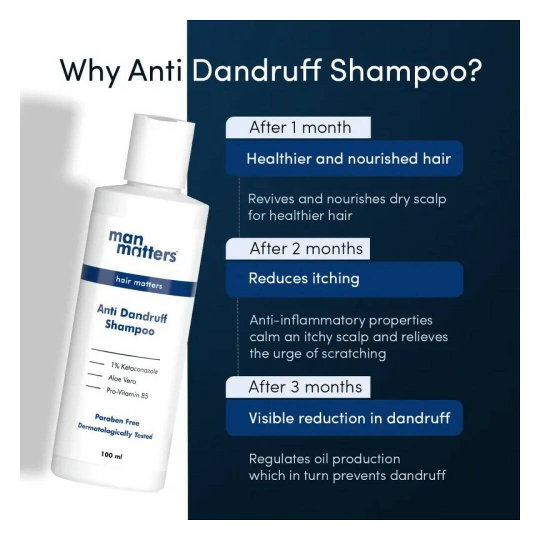 Man Matters Anti Dandruff Shampoo For MenAbout The Product:Heres a shampoo for dandruff, specifically co-curated by Expert to fight off stubborn dandruff without drying out your scalp and hair.Treat your hair problems with this shampoo today, enriched with Aloe Vera and Vitamin B5 to provide absolute hair nourishment.How To Use: Use Shampoo twice a weekRinse your hair, then pump out a coin sized amount of dandruff shampooMassage the anti dandruff shampoo into your wet scalpLeave anti-dandruff shampoo for 2-3 minutes, then rinse thoroughly with waterFor best results, use Man Matters Hair Serum after using the Shampoo.Legal Disclaimer: Product images are for illustrative purposes only. Images/packaging/ labels may vary from time to time due to changes made by the manufacture