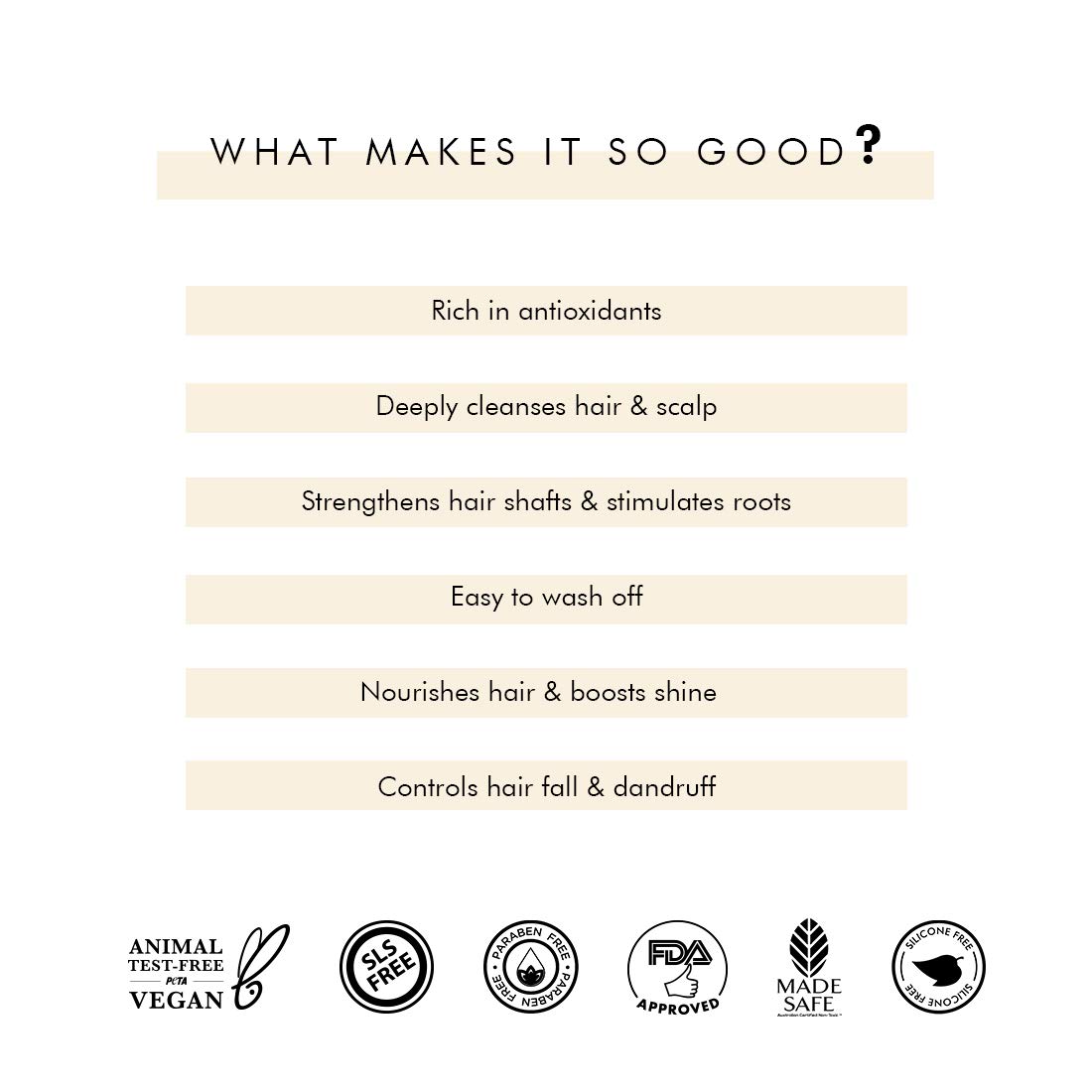MADE WITH CARE: All Hair care products are Peta Certified Sulphate & Silicone Free 100% Vegan SLS Paraben Free Dermatologically Tested FDA Approved Made Safe Made In India. **Coffee hair care products will show the effects in 6 to 8 weeks.