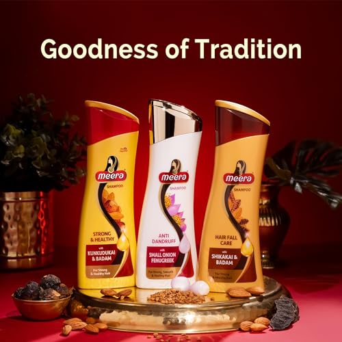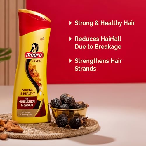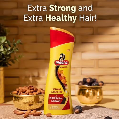 Make your hair healthy and stronger with all New Meera Shampoo! The all new Meera Strong & Healthy shampoo contains a unique Nourishment Lock System along with natural ingredients. It contains Kunkudukai that is known to gently cleanse your hair whilst Vitamin E enriched Almond is known to nourish it giving you stronger and healthier hair with every wash. Directions to use the shampoo: 1. After washing your hair thoroughly take 2 to 3 drops of the shampoo equal to size of a coin on your palm. 2. Then apply the shampoo gently massaging it all over your hair from the roots to the tips. 3. Leave the shampoo on your hair for a couple of minutes & then rinse it off completely.