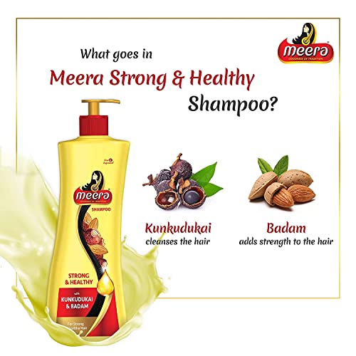 Make your hair healthy and stronger with all New Meera Shampoo! The all new Meera Strong & Healthy shampoo contains a unique Nourishment Lock System along with natural ingredients. It contains Kunkudukai that is known to gently cleanse your hair whilst Vitamin E enriched Almond is known to nourish it giving you stronger and healthier hair with every wash. Directions to use the shampoo: 1. After washing your hair thoroughly take 2 to 3 drops of the shampoo equal to size of a coin on your palm. 2. Then apply the shampoo gently massaging it all over your hair from the roots to the tips. 3. Leave the shampoo on your hair for a couple of minutes & then rinse it off completely.
