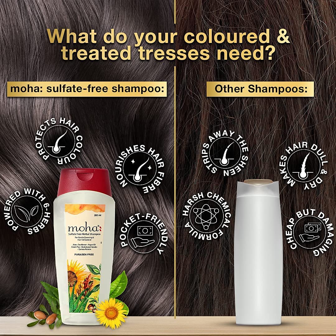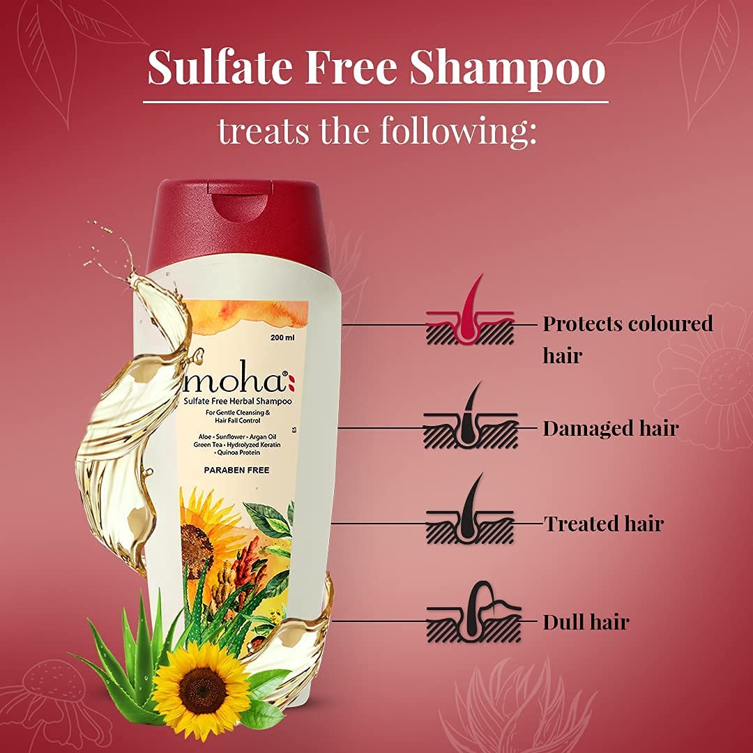 MOHA Sulfate-Free Herbal Shampoo helps to gently clean your scalp & hair helps in promoting strength & healthy shine. It helps in protects & smoothens the hair fiber and helps in long lasting radiance of colored hair.The mix of Aloe Sunflower and Green Tea rich with anti-oxidants protects the hair from free radical damage to control hair-fall and helps in prevent hair breakage. Hydrolyzed Keratin and Quinoa Protein give nourishment to helps in promote stronger softer and damage free hair IndicationColored hairTreated hairDull-damaged hair Directions for useApply to damp hair and massage gently into a rich lather. Rinse thoroughly and repeat if required. Key Ingredients-Aloe Effectively enhances hydration & nourishment of the hair and scalp Sunflower Oil - High in vitamin E and lecithin corrects hair breakage Argan Oil Rich in linoleic acid moisturizes the hair and protects hair colorGreen Tea - Rich in antioxidants promotes hair growth prevents hair fall Hydrolyzed Keratin - Provides smoothing element and enhance shine naturallyQuinoa Protein Rich in amino acids aids hair growth and prevents breakage