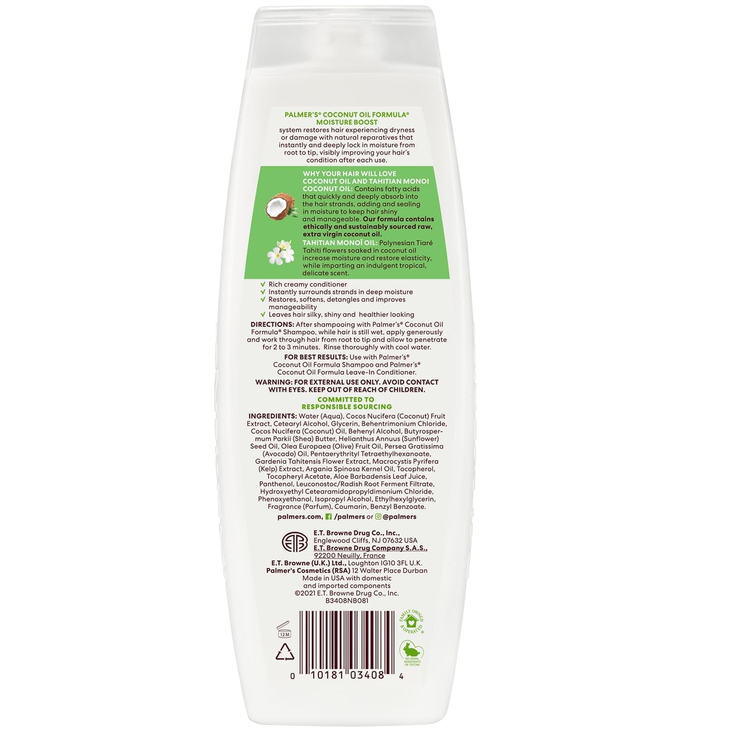 Palmer's Coconut Oil Formula Moisture Boost System restores hair experiencing dryness or damage with natural reparatives that instantly and deeply lock in moisture from root to tip visibly improving your hairs condition after each use. This rich creamy conditioner instantly surrounds strands in deep moisture to instantly detangle and improve softness and manageability. Leaves hair silky shiny and healthier looking.