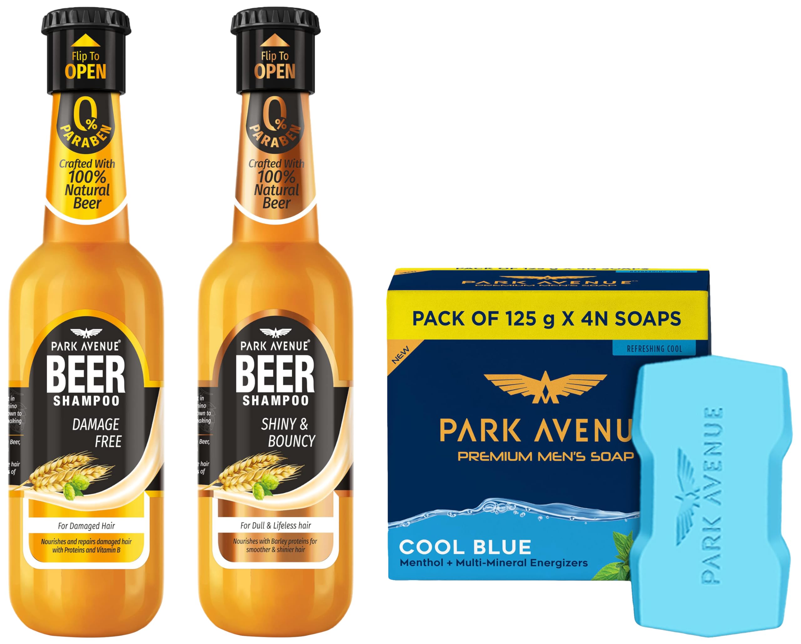 Park Avenue Premium Mens Soaps for Bath Cool Blue | 125g (Pack of 4) | Menthol & Mineral Energizer | Grade 1 Soap | For All Skin TypesPresenting Park Avenue Cool Blue mens bath soap which keeps you cool in the scorching heat of summer. The cool effect achieved from the mint extracts and other cooling components keeps you cool and light-headed even during the tiresome sunny days. Park Avenue Cool Blue body soap contains extra cooling properties which makes you feel an exotic chillness reminding you of the poles in summer! It gives you a tingling sensation of ice that sets your pulse racing. This body soap offers a refreshing scent reminiscent of a cool summer breeze. The menthol in it creates a harmonious fragrance that's perfect for the summer season. Elevate your daily grooming routine with the unmistakable cool essence of Park Avenue Cool Blue soap and stay refreshed all summer long. Explore the wide range of refreshing Park Avenue Premium Mens Soaps available in 3 variants namely Cool Blue Pure Luxury and Good Morning.Park Avenue Beer shampoo for Shiny And Bouncy hair with Hops Barley Proteins and Vit. B Paraben Free Natural Shine Smooth hair 180mlDeep Condition your hair with the properties of real beer using Park Avenue beer shampoo. It nourishes your hair making it shiny and strong from root to tip.Park Avenue Beer shampoo for Damage Free hair with Hops Barley Proteins and Vit. B 180mlThis richly lathering shampoo is packed with real beer which has excellent conditioning properties. It protects against hair damage from the roots leaving it strong and healthy. Leave you hair shiny non-sticky and bouncy with Park Avenue beer shampoo.