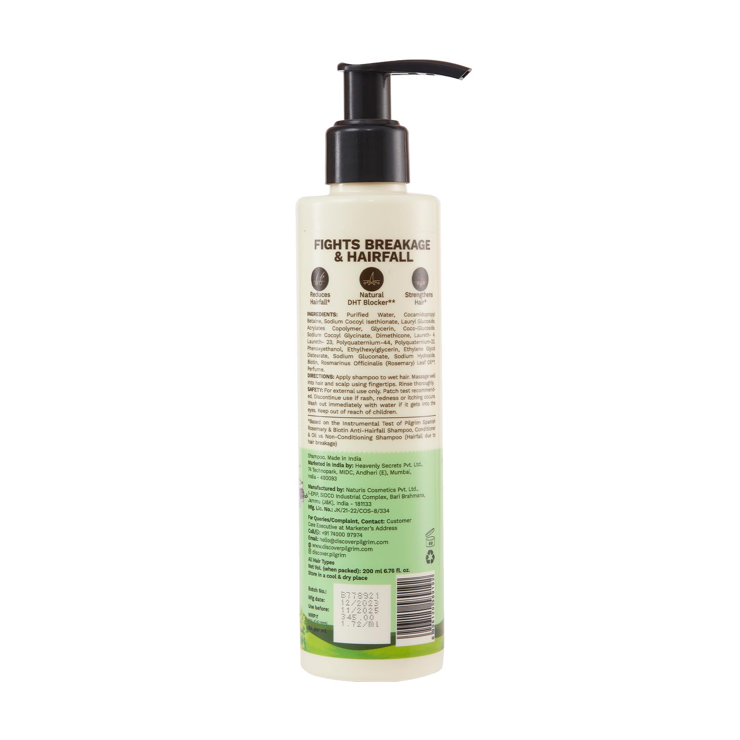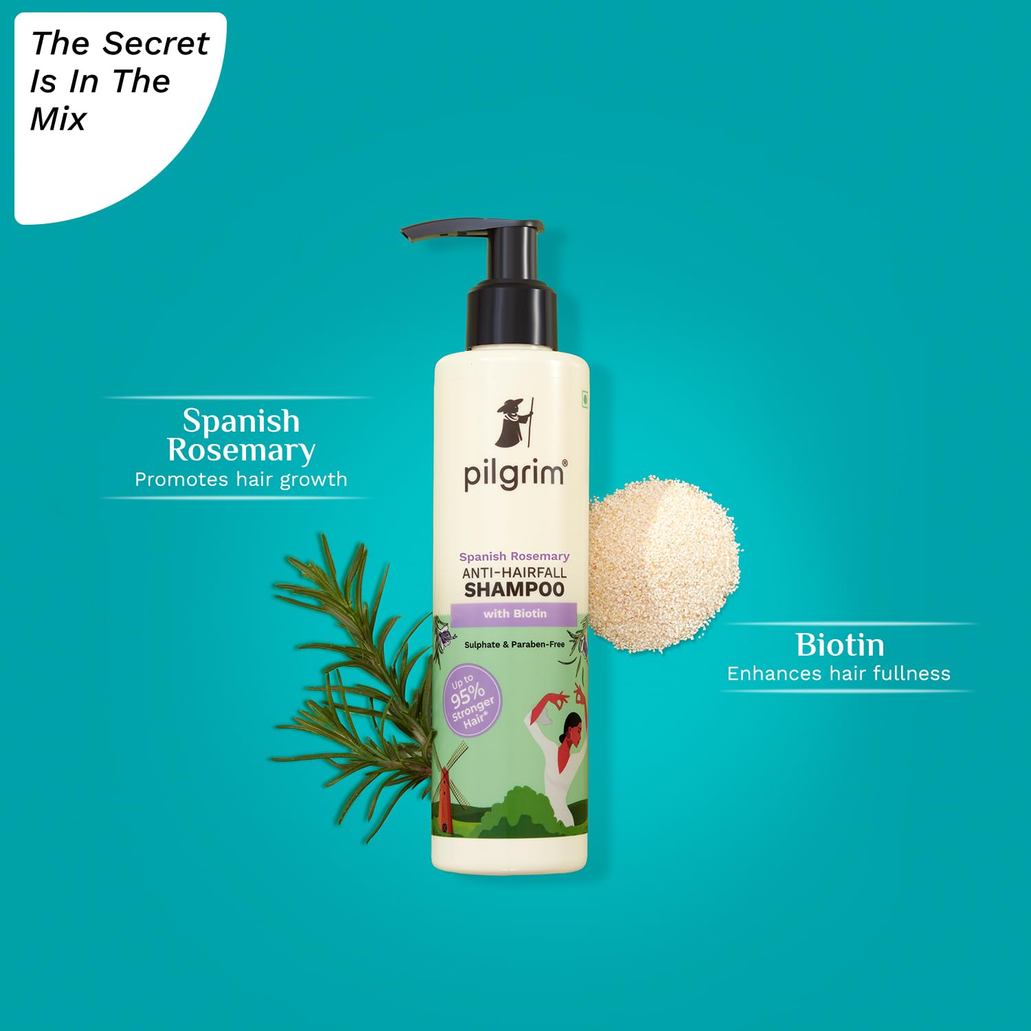 Concerned about hairfall and breakage? Say hello to a transformative anti-hairfall solution: Spanish Rosemary & Biotin Anti-Hairfall Shampoo. Crafted with a powerful blend of Spanish Rosemary and Biotin this shampoo strengthens hair by up to 95%* effectively reducing hairfall. (Based on the Instrumental Test of Pilgrim Spanish Rosemary & Biotin Anti-Hairfall Shampoo Conditioner & Oil vs Non-Conditioning Shampoo; Hairfall due to hair breakage). The world beauty secret in this anti-hairfall shampoo is Spanish Rosemary (Rosmarinus officinalis) a fragrant evergreen herb that hails from the sun-soaked Mediterranean region. Traditionally valued in Mediterranean countries to tackle hairfall Spanish Rosemary oil has been used in hair rituals for hundreds of years. This ancient remedy has been supported by clinical studies which show that rosemary oil is effective in supporting hair growth. Here's how it works. Spanish Rosemary blocks the activity of Dihydrotestosterone (DHT) a hormone linked to hair loss. It stops DHT's harmful effects by inhibiting the enzyme 5 alpha-reductase resulting in less hair fall. The formula gains an extra edge with Biotin a B-complex vitamin that increases scalp circulation increases hair density and strengthens follicles. With every wash this transformative shampoo rejuvenates strands. Experience the revitalizing touch of Spanish Rosemary & Biotin Anti-Hairfall Shampoo - your hair isn't just surviving; it's thriving.
