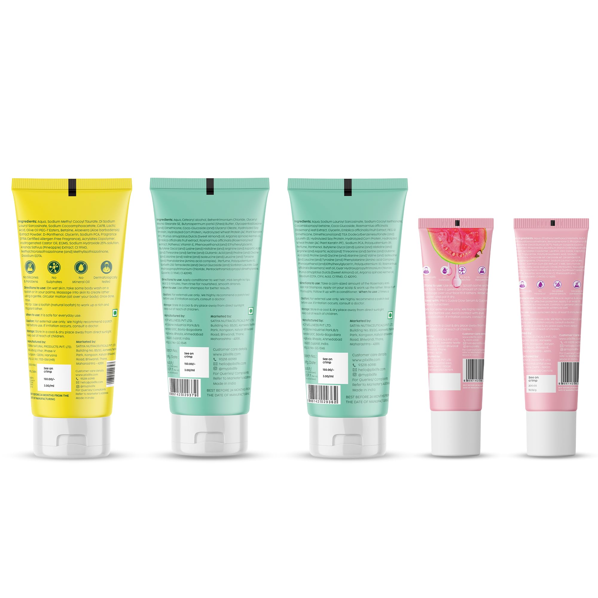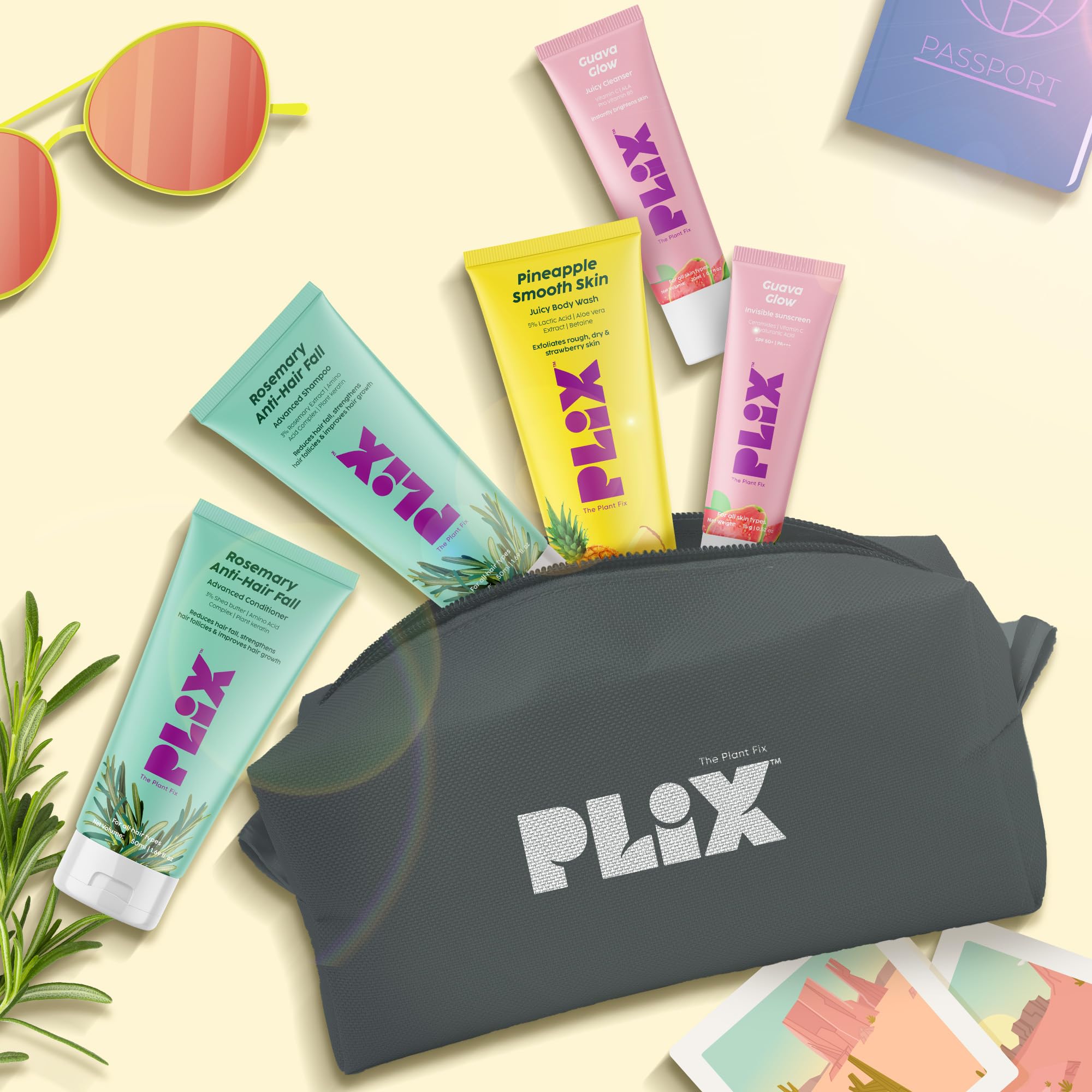 Introducing the Plix Travel Kit your essential companion for achieving radiant skin and healthy hair anywhere you go. This comprehensive kit includes the Guava Glow Juicy Cleanser enriched with Vitamin C for brightening and even skin tone alongside the Pineapple Exfoliating Body Wash that gently buffs away dry pigmented skin. For hair care the Rosemary Anti-Hairfall Advanced Shampoo and Conditioner duo strengthens hair with rosemary extract and nourishes with shea butter and plant keratin leaving hair smooth and manageable. Complete your routine with the Guava Glow Invisible Dewy Sunscreen SPF50+ PA+++ providing broad-spectrum UV protection with a lightweight hydrating formula. Compact and travel-friendly this pouch ensures your skincare needs are met with every journey maintaining healthy skin and vibrant hair wherever you roam.