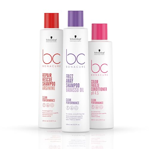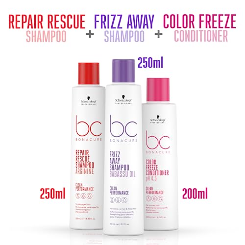 Schwarzkopf Professional Bonacure Combo - Frizz Away Shampoo with Babassu Oil (250 ml) | For Frizzy Hair and Color Freeze Conditioner pH 4.5 (250 ml) | For Colored Hair and Repair Rescue Shampoo with Arginine (250 ml) | For Damaged Hair