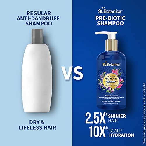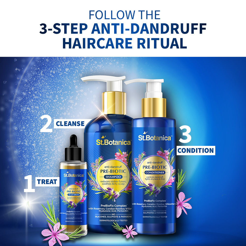 What is it? An anti-dandruff Pre-biotic Shampoo powered by the goodness of PreBioFix Complex⢠that clarifies scalp to remove & prevent dandruff. The scalp balancing shampoo comes with a gentle cleansing action that doesnât strip off natural oils and leaves the scalp hydrated. With the power of Pre-biotics this everyday shampoo targets dandruff at its root cause ing the scalp microbiome. It comes with a blend of Rosemary Oil Canadian Rosebay Hyaluronic Acid & Pentavitin. It is a dermatologically tested formulation that is safe for your scalp and hair. Tired of off dandruff every day? It's time to upgrade to St.Botanica's Anti-Dandruff Pre-biotic Shampoo! An innovative formula PreBioFix Complex⢠goes straight to the root of the problem ing your scalp's microbiome and sending dandruff packing. No more flakes no more itch - just a gorgeous head of healthy hydrated hair! PreBioFix Complex⢠is backed with some of the world finest ingredients like Rosemary Oil Canadian Rosebay Hyaluronic Acid & Pentavitin to give you unbeatable results. Get ready for 100% DANDRUFF REMOVAL in just 7 days* 2.5X SHINIER* hair and 10X SCALP HYDRATION.* It's the ultimate formula for keeg your scalp flake-free and your strands soft and luscious. The anti-dandruff shampoo is toxin-free & has No Sulphates Parabens & Silicones giving your hair a gentle cleansing experience. Disclaimer: 1. 100% dandruff free hair in 7 days Disclaimer: 84% consumers noticed reduction in flakes. Based on consumer study conducted in Feb 2023. 2.10X more scalp hydration Disclaimer: Based on comparative study conducted at NABL accredited lab 3. 2.5X Shinier Hair Disclaimer: Based on comparative study conducted at NABL accredited lab