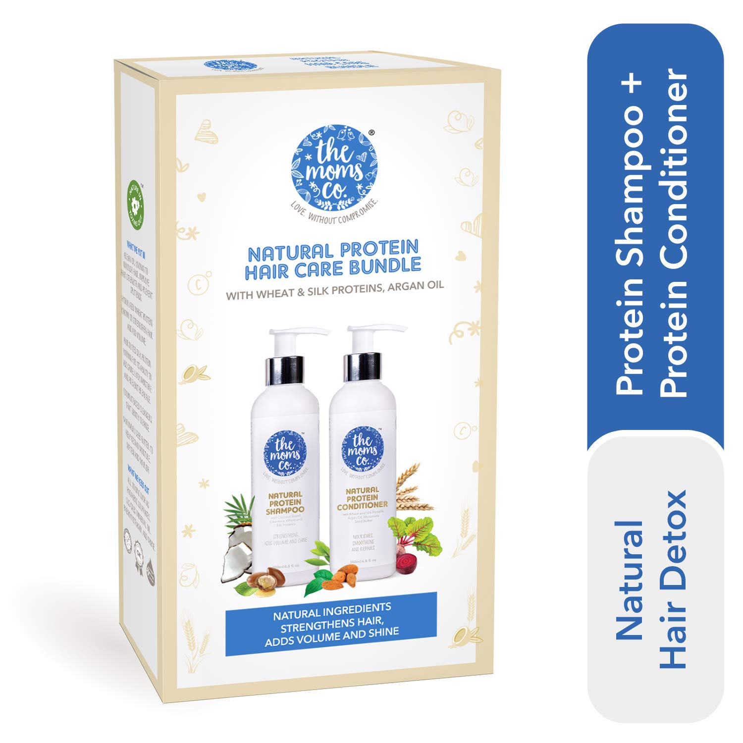 The Moms Co. Natural Protein Hair Strengthening Shampoo & Conditioner Bundle | Strengthens Hair Adds Volume and Shine | Sulphate and Paraben Free Shampoo & Conditioner 200 ML + 200 MLThe Moms Co. Natural protein shampoo are conditioner are India's only made safe all-natural Australia-certified toxin-free coconut based hair detox kit. Typical rich-lathering shampoos rob your hair of their protein and leave a layer of chemicals causing dandruff and hair fall! With the first use of our shampoo you're well on your way for your first hair detox and in 4-5 washes you should start seeing a visible difference! Suitable for anyone looking to reverse the harmful effects of chemicals hair treatments and pollution. It is a combination of gentle coconut based cleansers that gently clean and are safe even as a hair colour shampoo or keratin shampoo.The Moms Co Natural Hair Serum With Moroccan Argan Oil Wheat & Oat Protein Controls Frizz Smoothens and Repairs Hair (100 ml)The Moms Co Natural Hair Serum With Moroccan Argan Oil Wheat & Oat Protein Controls Frizz Smoothens and Repairs Hai
