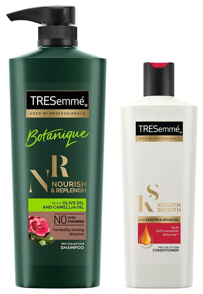 TRESemme Botanique Nourish & Replenish Shampoo 580 ml With Olive & Camellia Oil for Frizz Control & Hair Growth Paraben Free Smoothens Dry HairInfused with a rich botanical blend of olive oil and camellia oil TRESemmé Botanique Nourish & Replenish is a natural shampoo that gently cleanses and nourishes your hair. Rich in Vitamin A B C and E Olive oil and Camellia oil help stimulate hair growth and clean your follicles of collected dirt. They also soften your hair and help in retaining moisture. Botanique Nourish & Replenish Shampoo is equipped with patented micro-moisture technology that smoothens and protects dry hair from damage. Its expertly crafted mild system contains no parabens or dyes and is safe for color-treated hair. This nourishing shampoo can also control frizz for upto 24 hours. It deeply moisturizes your hair leaving it beautifully soft smooth and shiny. TRESemmé Botanique Nourish & Replenish Shampoo is especially formulated for Indian hair and is suitable for use in conjunction with oil treatments. Buy today to get softer smoother and healthier looking salon quality hair without the salon price tag! For best results use this shampoo with TRESemmé Botanique Nourish & Replenish Conditioner. Suitable for both men and women. To use: Apply to wet hair and gently massage to work into a lather. Rinse thoroughly. Follow up with the TRESemmé Botanique Nourish & Replenish Conditioner for an extra boost of nourishment.TRESemme Smooth & Shine Conditioner 335 mlDeep condition your hair and protect them from damage to get smoother hair with the TRESemmé Keratin Smooth Conditioner. With its lower sulfate formulation it helps restore keratin in your hair and nourishes its every strand to leave your hair straighter and shinier. Infused with Keratin and light-weight Argan oil this nourishing conditioner can make your hair visibly straight and smoother. The Keratin-Argan Oil formulation conditions and strengthens your hair as well as provides them the hydration and elasticity that they need. With its dual action TRESemmé Keratin Smooth professional conditioner can make your hair up to 100% smoother and give them extra shine. It is suitable for use for both naturally and chemically treated hair. When used together with the TRESemmé Keratin Smooth Shampoo it controls frizz for up to 3 amazing days helping you tame your frizz and giving you silky smooth hair. So say no to frizzy hair and say yes to gorgeous salon smooth hair without the salon price tag! Suitable for both men & women. To use: After shampoo apply an adequate amount of TRESemmé Keratin Smooth Conditioner from mid-lengths to the ends. Leave it on for 2-3 minutes and let it work its magic. Rinse your hair thoroughly with lukewarm water. For best results use with TRESemmé Keratin Smooth Shampoo.
