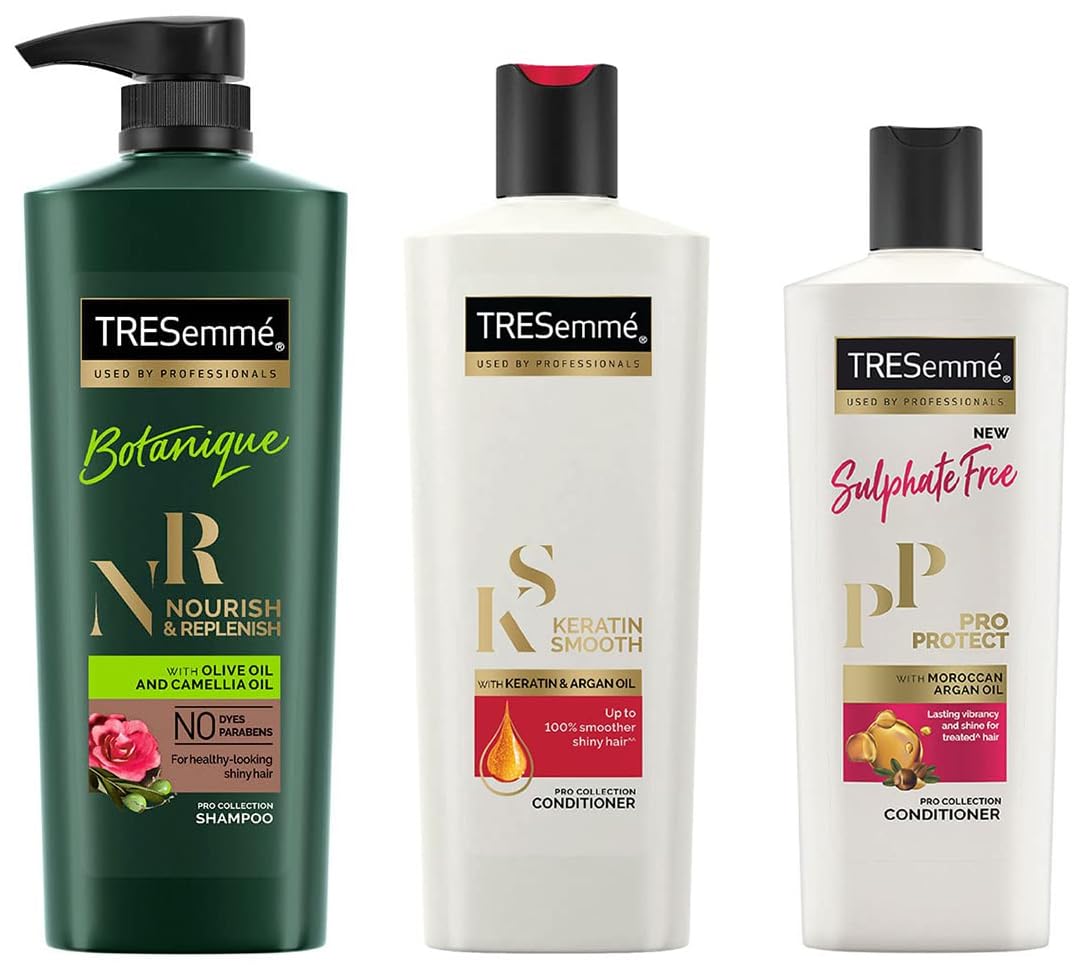 TRESemme Botanique Nourish & Replenish Hair Shampoo 580 ml Mild Shampoo for Dry and Frizzy Hair Paraben Free Smoothens Dry Hair - for Women & MenInfused with a rich botanical blend of olive oil and camellia oil TRESemmé Botanique Nourish & Replenish is a natural shampoo that gently cleanses and nourishes your hair. Rich in Vitamin A B C and E Olive oil and Camellia oil help stimulate hair growth and clean your follicles of collected dirt. They also soften your hair and help in retaining moisture. Botanique Nourish & Replenish Shampoo is equipped with patented micro-moisture technology that smoothens and protects dry hair from damage. Its expertly crafted mild system contains no parabens or dyes and is safe for color-treated hair. This nourishing shampoo can also control frizz for upto 24 hours. It deeply moisturizes your hair leaving it beautifully soft smooth and shiny. TRESemmé Botanique Nourish & Replenish Shampoo is especially formulated for Indian hair and is suitable for use in conjunction with oil treatments. Buy today to get softer smoother and healthier looking salon quality hair without the salon price tag! For best results use this shampoo with TRESemmé Botanique Nourish & Replenish Conditioner. Suitable for both men and women. To use: Apply to wet hair and gently massage to work into a lather. Rinse thoroughly. Follow up with the TRESemmé Botanique Nourish & Replenish Conditioner for an extra boost of nourishment.TRESemme Keratin Smooth Conditioner 335 ml With Keratin & Argan Oil for Straight Shiny Hair - Nourishes Dry Hair & Controls Frizz For Men & WomenDeep condition your hair and protect them from damage to get smoother hair with the TRESemmé Keratin Smooth Conditioner. With its lower sulfate formulation it helps restore keratin in your hair and nourishes its every strand to leave your hair straighter and shinier. Infused with Keratin and light-weight Argan oil this nourishing conditioner can make your hair visibly straight and smoother. The Keratin-Argan Oil formulation conditions and strengthens your hair as well as provides them the hydration and elasticity that they need. With its dual action TRESemmé Keratin Smooth professional conditioner can make your hair up to 100% smoother and give them extra shine. It is suitable for use for both naturally and chemically treated hair. When used together with the TRESemmé Keratin Smooth Shampoo it controls frizz for up to 3 amazing days helping you tame your frizz and giving you silky smooth hair. So say no to frizzy hair and say yes to gorgeous salon smooth hair without the salon price tag! Suitable for both men & women. To use: After shampoo apply an adequate amount of TRESemmé Keratin Smooth Conditioner from mid-lengths to the ends. Leave it on for 2-3 minutes and let it work its magic. Rinse your hair thoroughly with lukewarm water. For best results use with TRESemmé Keratin Smooth Shampoo.TRESemme Pro Protect Sulphate Free Conditioner 190 mlLaunched in 1948 TRESemmé was named after renowned hair care expert Edna Emmé. Up until the 1950s TRESemmé was sold only in salons. Today it is available at a shop near you so that you can have salon-style hair at home. For over 60 years TRESemmé has built a history of success in thirteen countries around the world. From its origins in 1947 and salon expertise TRESemmé  has been driven by a simple truth: Every woman deserves to look and feel fabulous like she has just stepped out of the salon everyday. This range has also been carefully selected for its advanced formula. TRESemmé Pro Protect Shampoo is the first sulphate-free variant which is infused with the goodness of Moroccan Argan Oil. It is highly beneficial for people having coloured hair because it helps in retaining hair colour along with lending a long-lasting vibrancy and shine to the hair. For best results use it with TRESemmé Pro Protect Conditioner.