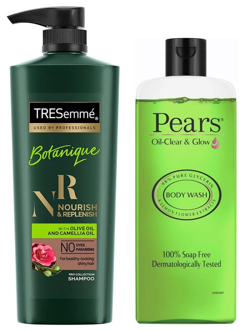 TRESemme Botanique Nourish and Replenish Shampoo 580mlLaunched in 1948 TRESemmé was named after renowned hair care expert Edna Emmé. Up until the 1950's TRESemmé was sold only in salons. Today it is available at a shop near you so that you can have salon style hair at home. For over 60 years TRESemmé has built a history of success in 13 countries around the world. From its origins in 1947 and salon expertise TRESemme has been driven by a simple truth: every woman deserves to look & feel fabulous like she has just stepped out of the salon everyday. This range has been carefully selected for its advanced formula. Driven by our salon heritage we work with our stylists to deliver expert solutions from salon quality products without the salon price tag. Our expertly crafted system is infused with rich botanical blend of olive oil and camelia oil. The system gently cleanses and nourishes hair leaving hair feeling moisturized and beautifully soft. It does not contain Parabens or Dyes and is also safe for color-treated hair. Apply the TRESemme Botanique Nourish & Replenish Shampoo to wet hair gently massage into scalp and work into a lather. Rinse thoroughly from roots to tips. Follow with TRESemme Botanique Nourish & Replenish ConditionePears Oil Clear and Glow Shower Gel 250mlTry the new pears oil-clear and glow body wash crafted with 98 percent pure glycerin and lemon flower extract. It is a pure and gentle cleanser for your body that leaves your skin feeling soft smooth and moisturised. Pears body wash is mild and gentle and cleanses your skin thoroughly. It is 100 percent soap free and dermatologically tested. It helps moisturise your skin so that it does not dry. With natural oils it is a gentle cleanser for your body.