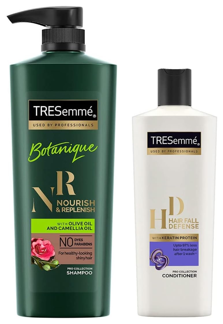 TRESemme Botanique Nourish and Replenish Shampoo 580mlLaunched in 1948 TRESemmé was named after renowned hair care expert Edna Emmé. Up until the 1950's TRESemmé was sold only in salons. Today it is available at a shop near you so that you can have salon style hair at home. For over 60 years TRESemmé has built a history of success in 13 countries around the world. From its origins in 1947 and salon expertise TRESemme has been driven by a simple truth: every woman deserves to look & feel fabulous like she has just stepped out of the salon everyday. This range has been carefully selected for its advanced formula. Driven by our salon heritage we work with our stylists to deliver expert solutions from salon quality products without the salon price tag. Our expertly crafted system is infused with rich botanical blend of olive oil and camelia oil. The system gently cleanses and nourishes hair leaving hair feeling moisturized and beautifully soft. It does not contain Parabens or Dyes and is also safe for color-treated hair. Apply the TRESemme Botanique Nourish & Replenish Shampoo to wet hair gently massage into scalp and work into a lather. Rinse thoroughly from roots to tips. Follow with TRESemme Botanique Nourish & Replenish ConditioneTRESemme Hair Fall Defense Conditioner 190mlLaunched in 1948 TRESemmé was named after renowned hair care expert Edna Emmé. Up until the 1950's TRESemmé was sold only in salons. Today it is available at a shop near you so that you can have salon style hair at home. For over 60 years TRESemmé has built a history of success in 13 countries around the world. From its origins in 1947 and salon expertise TRESemme has been driven by a simple truth: every woman deserves to look & feel fabulous like she has just stepped out of the salon everyday. This range has been carefully selected for its advanced formula. Driven by our salon heritage we work with our stylists to deliver expert solutions from salon quality products without the salon price tag. Our salon inspired products enriched with high quality ingredients help you experience that salon feeling everyday. The Tresemme Hair Fall Defense Conditioner helps reinforce your hair strength and prevents hair fall due to breakage. For longer and stronger hair. Enriched with advanced quality ingredients the formula is scientifically constituted to give you longer stronger & manageable hair with every wash. It works best on damaged and breakage-prone hair.Get this bottle of 200 ml now and give your hair a luscious confident bounce. For best results use daily with TRESemme Hair Fall Defense Shampoo.