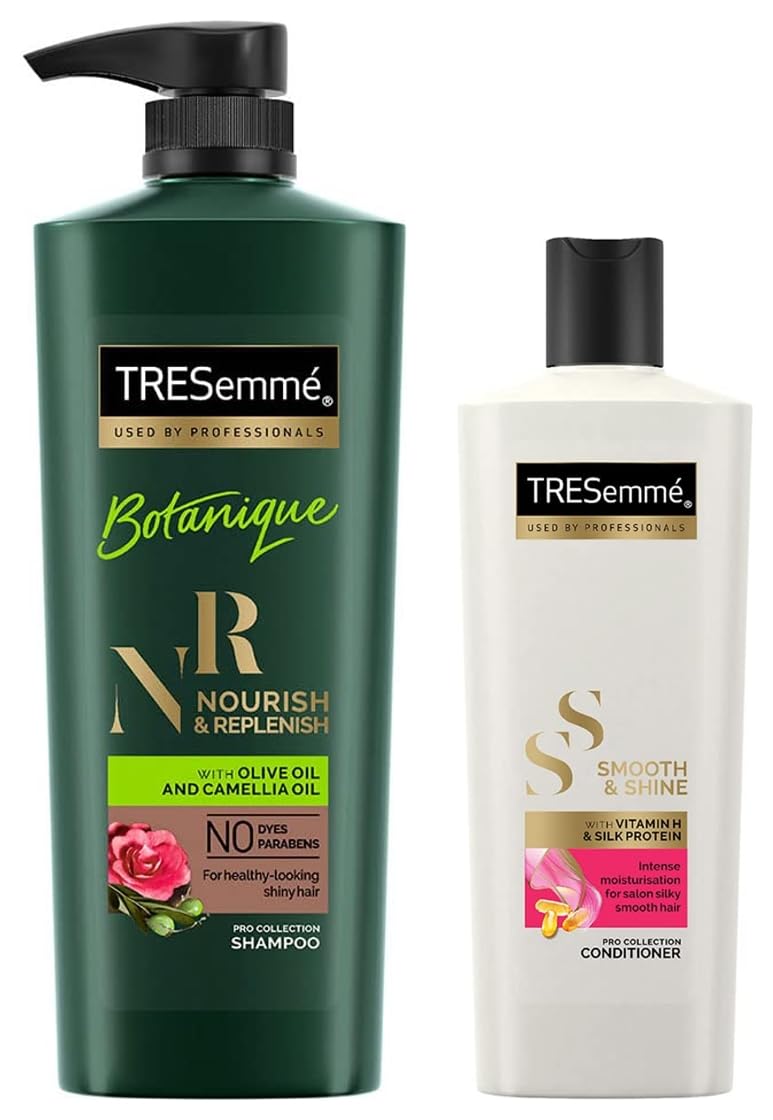 TRESemme Botanique Nourish and Replenish Shampoo 580mlLaunched in 1948 TRESemmé was named after renowned hair care expert Edna Emmé. Up until the 1950's TRESemmé was sold only in salons. Today it is available at a shop near you so that you can have salon style hair at home. For over 60 years TRESemmé has built a history of success in 13 countries around the world. From its origins in 1947 and salon expertise TRESemme has been driven by a simple truth: every woman deserves to look & feel fabulous like she has just stepped out of the salon everyday. This range has been carefully selected for its advanced formula. Driven by our salon heritage we work with our stylists to deliver expert solutions from salon quality products without the salon price tag. Our expertly crafted system is infused with rich botanical blend of olive oil and camelia oil. The system gently cleanses and nourishes hair leaving hair feeling moisturized and beautifully soft. It does not contain Parabens or Dyes and is also safe for color-treated hair. Apply the TRESemme Botanique Nourish & Replenish Shampoo to wet hair gently massage into scalp and work into a lather. Rinse thoroughly from roots to tips. Follow with TRESemme Botanique Nourish & Replenish ConditioneTRESemme Smooth & Shine Conditioner 340 mlLaunched in 1948 TRESemmé was named after renowned hair care expert Edna Emmé. Up until the 1950's TRESemmé was sold only in salons. Today it is available at a shop near you so that you can have salon style hair at home. For over 60 years TRESemmé has built a history of success in 13 countries around the world. From its origins in 1947 and salon expertise TRESemme has been driven by a simple truth: every woman deserves to look & feel fabulous like she has just stepped out of the salon everyday. This range has been carefully selected for its advanced formula. Driven by our salon heritage we work with our stylists to deliver expert solutions from salon quality products without the salon price tag. Our salon inspired products enriched with ingredients help you experience that salon feeling everyday. With Vitamin H and silk protein TRESemme Smooth & Shine conditioner provides intense moisturisation for salon smooth silky hair. It has an advanced smoothing system that is enriched with Moroccan Argan oil. It controls frizz and fly aways without weighing your hair down. For hair that feels detangled more manageable soft and smooth. For best results use after the TRESemme Smooth & Shine Shampoo.