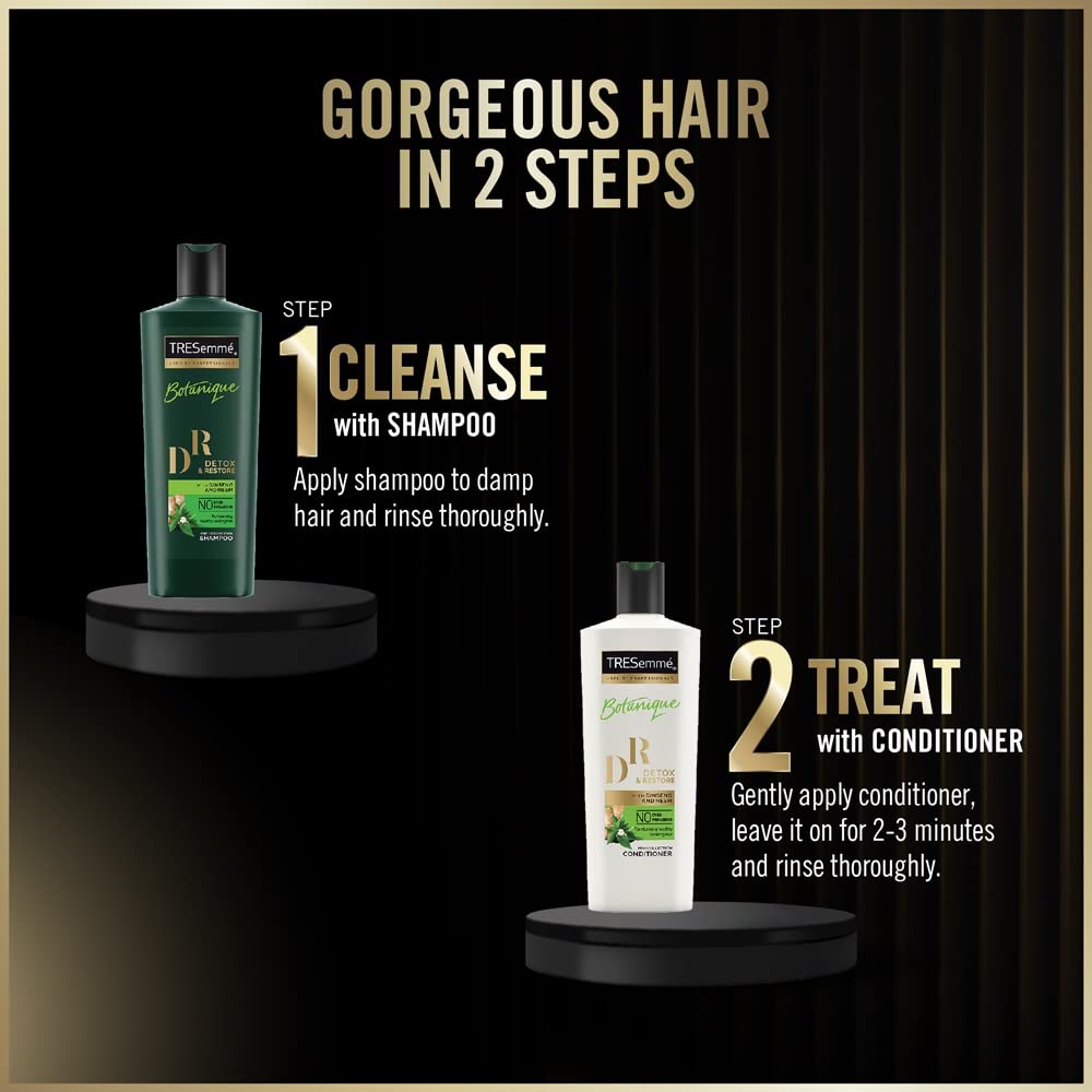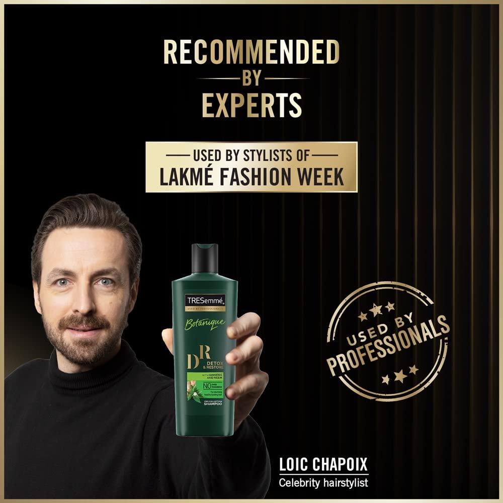 TRESemmé Botanique Detox & Restore Shampoo is a natural shampoo that contains an antioxidant botanical blend of ginseng and neem which helps nourish weak and damaged hair cuticles reviving your hair and restoring their manageability. Ginseng is known to give a healthy scalp and hair while neem is known for its antibacterial and antifungal properties which help tackle various hair problems. TRESemmé Botanique Detox & Restore Shampoo contains no parabens or dyes and gently purifies your hair of daily residue build-up. Our expertly crafted mild system gives you soft shiny salon smooth hair. TRESemmé Botanique Detox & Restore Shampoo also provides frizz control for up to 24 hours. It is safe for color treated hair and especially formulated for Indian hair. It is also suitable for use in conjunction with oil treatments. For best results use with TRESemmé Botanique Detox & Restore Conditioner. This nourishing shampoo is exactly what you need for smooth healthier hair. So detox your way to stunning healthy looking hair now with every wash and get salon quality hair without the salon price tag! Suitable for both men and women. To use: Apply the TRESemmé Botanique Detox & Restore Shampoo to wet hair gently massage and work into a lather. Rinse thoroughly. For an extra boost of delicious fragrance follow with TRESemmé Botanique Detox & Restore Conditioner.